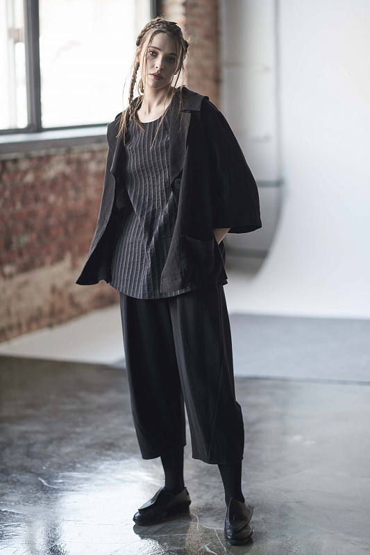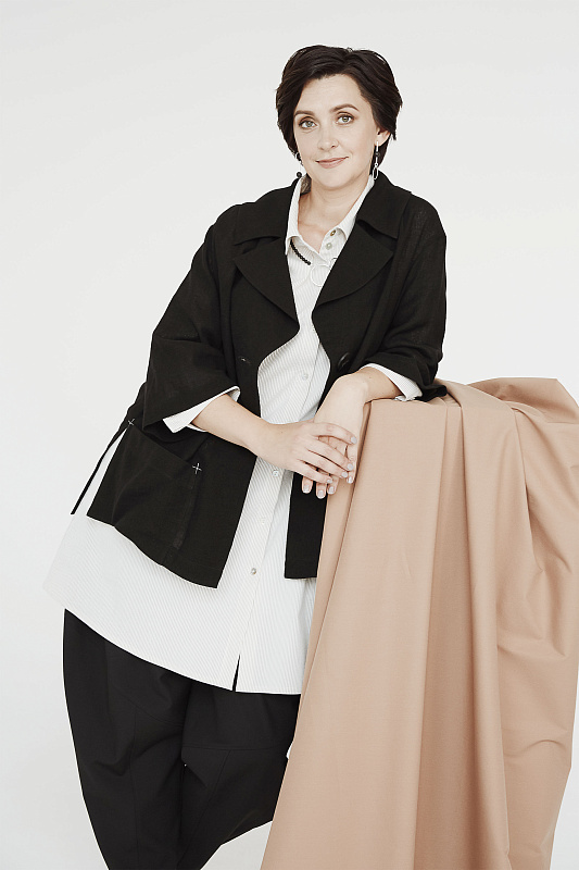 Блуза-жакет, с не глубокими боковыми разрезами и накладными карманами-портфелями из мягкого и экологичного льна. Длина по спинке 72 см.