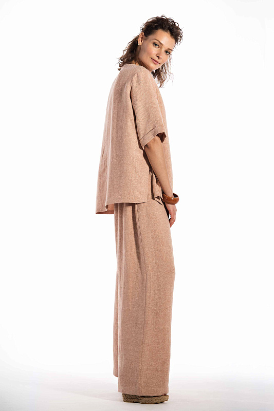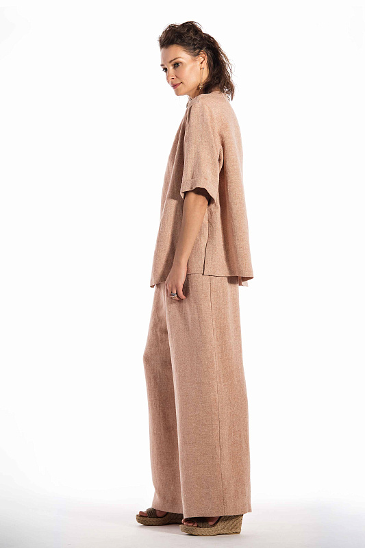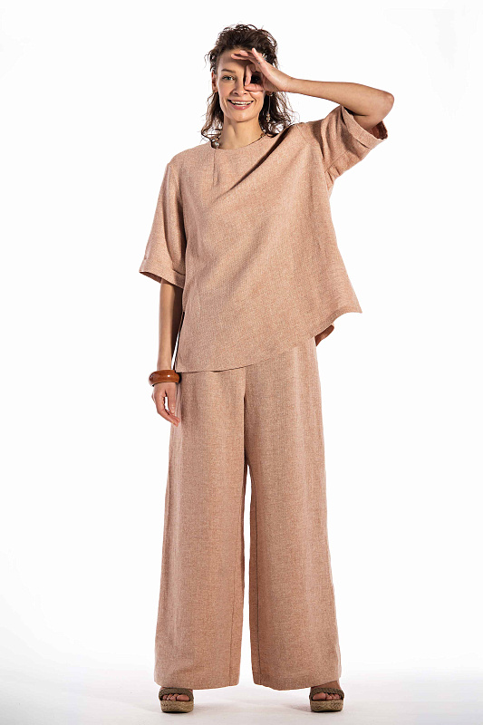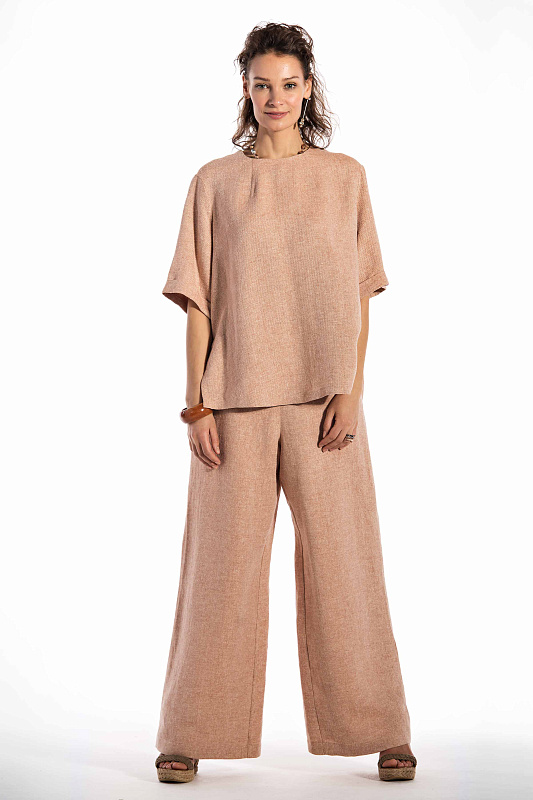 Эффектная блуза минималистического кроя изо льна с добавлением шелка, прямого силуэта, круглая горловина.