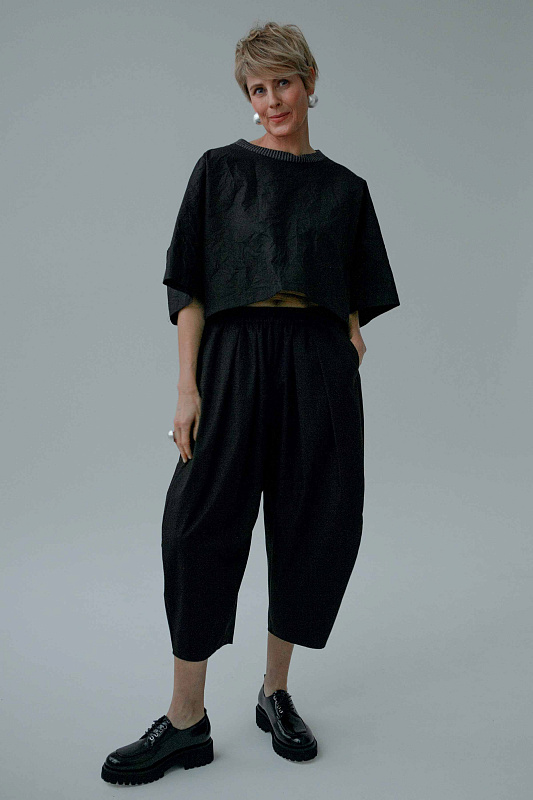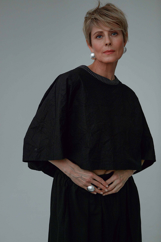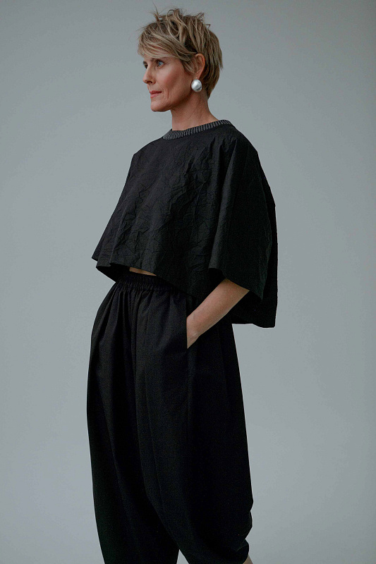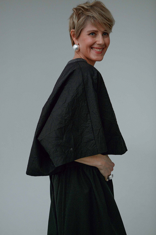 Концептуальная блуза силуэта пончо из хлопка с эффектом жатки. Горловина с вискозным подвязом. Без застежек.