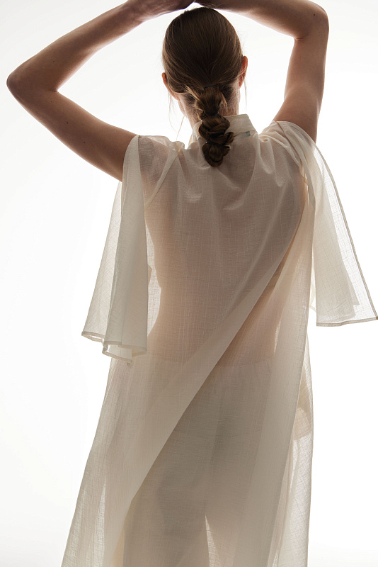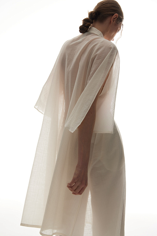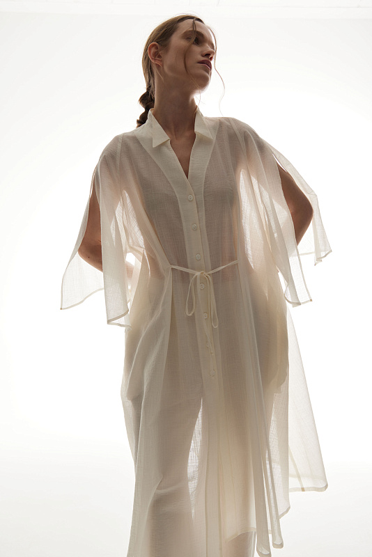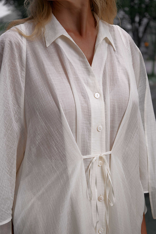 Для пошива удлиненной блузы использован полупрозрачный фактурный хлопок с деликатным блеском. Блуза застегивается на маленькие пуговички. Глубокие разрезы на рукавах позволяют по-разному стилизовать эту модель. Удобные карманы в боковых швах добавляют образу расслабленности. С помощью тонких шнурков можно подчеркнуть талию.