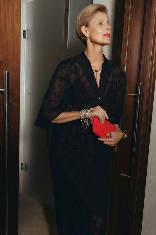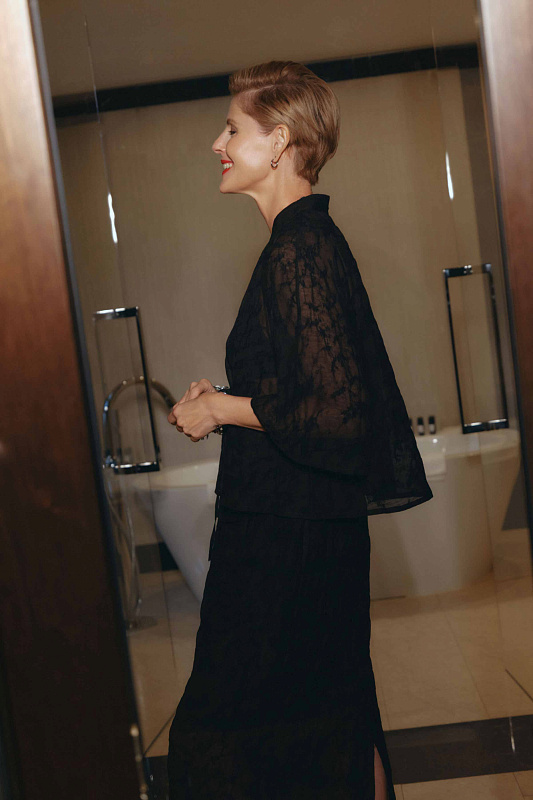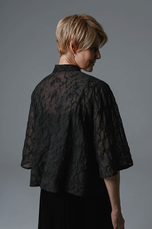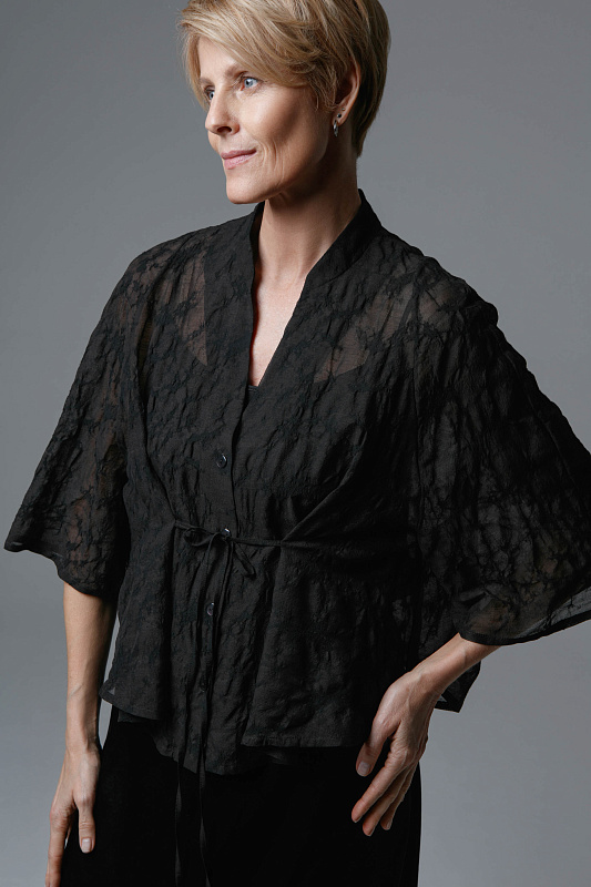 Легкая блуза из невесомого прозрачного жаккарда со слегка жатой структурой. Уникальная ткань сочетает в себе шерсть и шелк, олицетворяет легкость и одновременно сохраняет тепло. В зоне талии предусмотрены наружные завязки, позволяющие регулировать посадку по фигуре. Свободные рукава благородной длины ¾. Застежка на маленькие пуговицы. Элегантный V-образный вырез визуально удлиняет шею. Рекомендуем носить как самостоятельную модель, так и в комплекте с юбкой из той же капсулы.