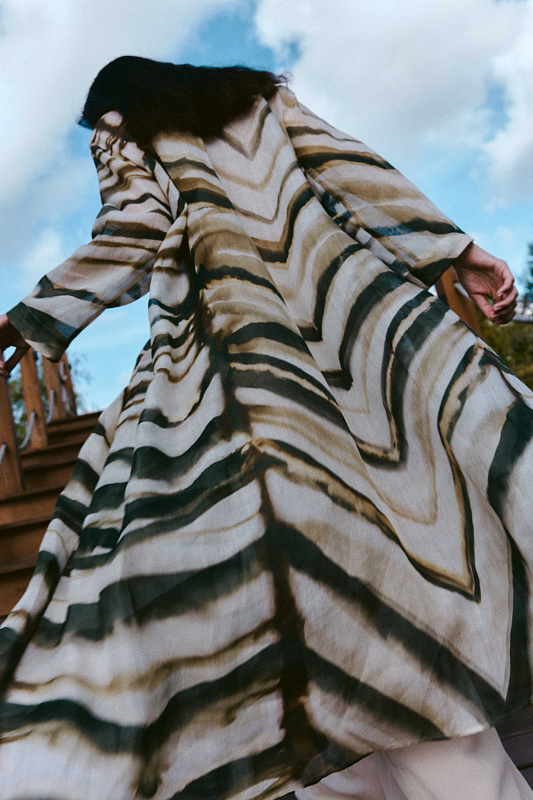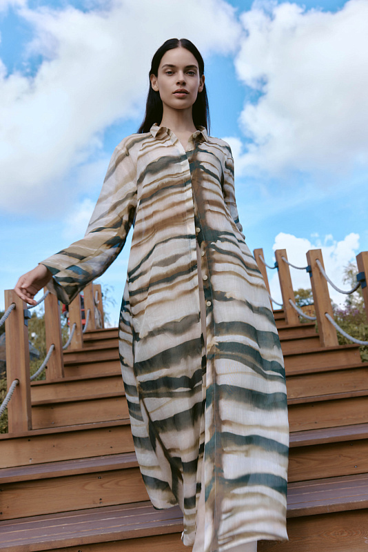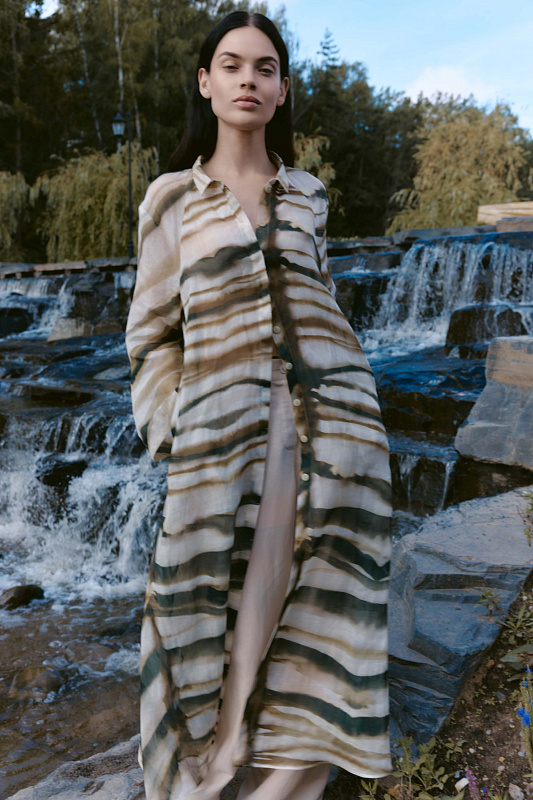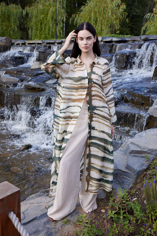 Удлинённая, полупрозрачная блуза с оригинальным принтом в виде акварельных зигзагов выполнена из хлопковой ткани с добавлением льна. Рубашечный воротник на блузе, а так же рукав реглан — это классические элементы, которые придают модели невероятную красоту и элегантность, маленькие пуговицы скрыты под планкой. Карманы в швах замаскированы причудливым принтом. Наши стилисты рекомендуют носить эту блузу с джинсами, льняными брюками или использовать её в качестве лёгкой накидки поверх платья. Фантазируйте, дерзайте и будьте уникальны.