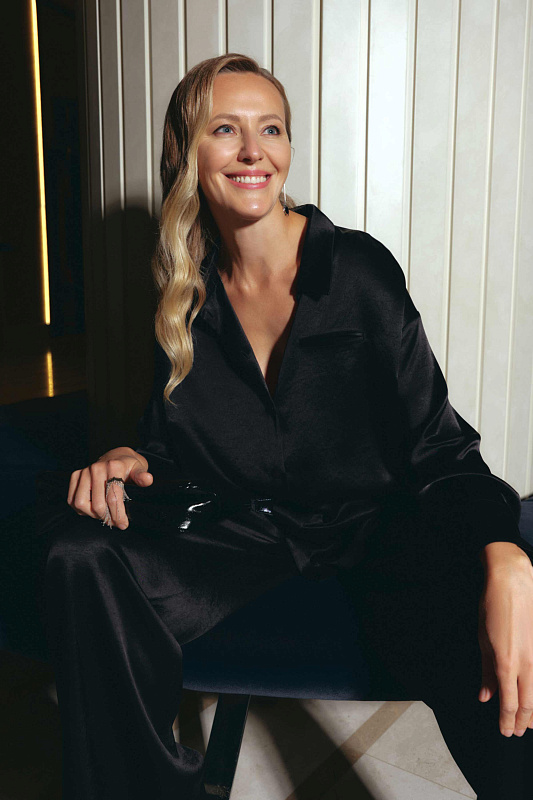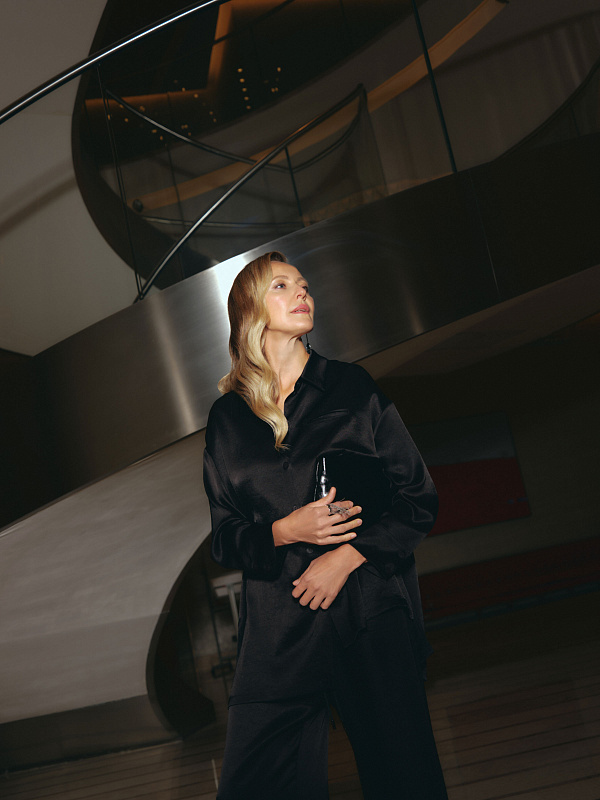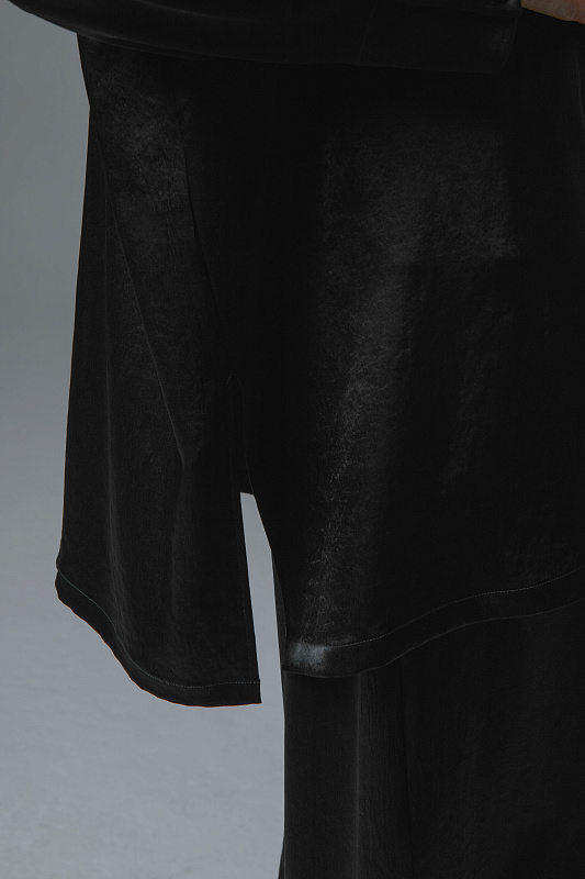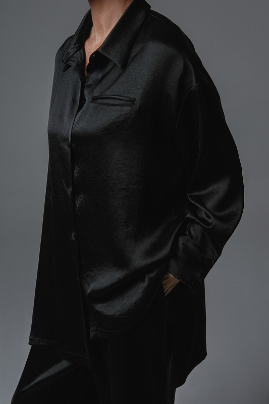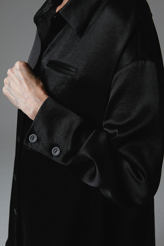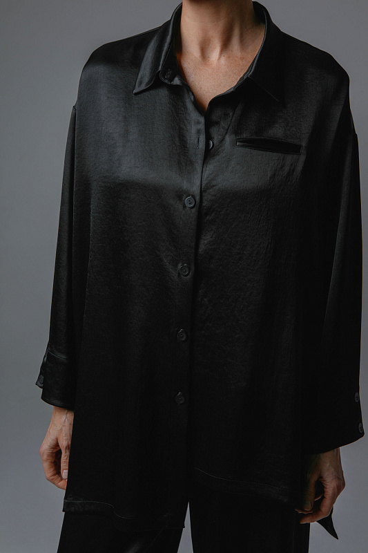 Блуза рубашечного кроя из шелковистого атласа с удлиненной спинкой. Воротник на отрезной стойке. На верхней полочке имитация кармана. Застежка на пуговицы. Втачной рукав на манжете. Удлиненная спинка и разрезы по бокам гарантируют дополнительный комфорт. Можно носить с юбкой или брюками из одноименной капсулы.