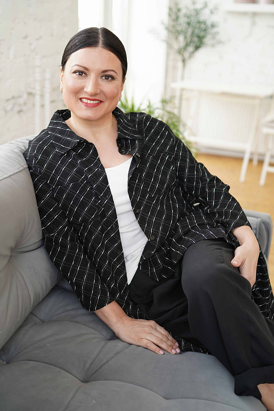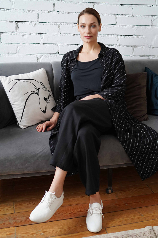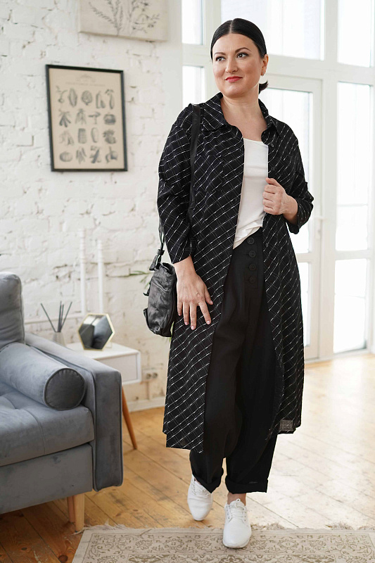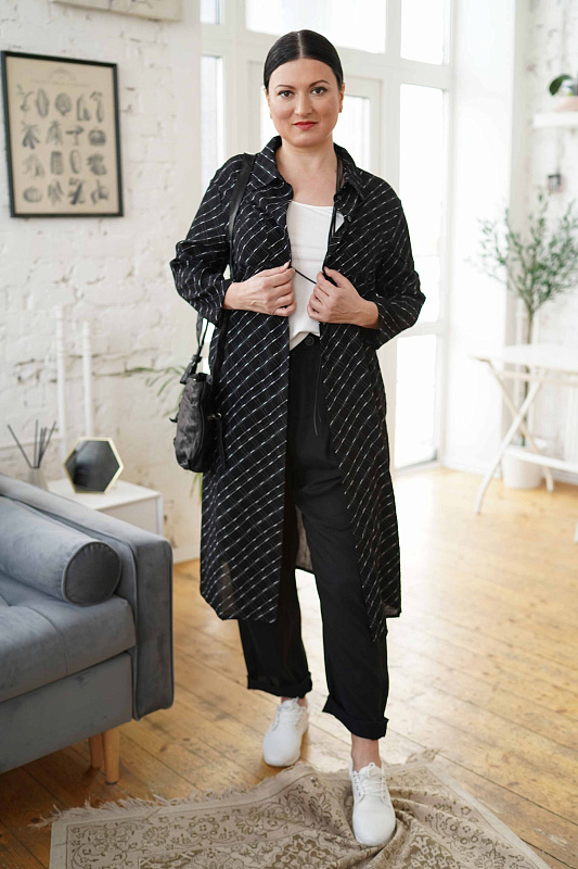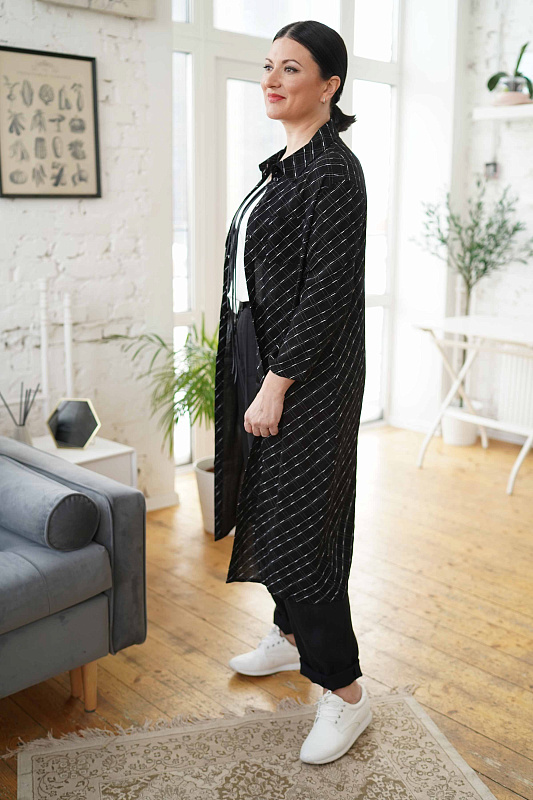 Длинная рубашка на пуговицах из вискозной ткани в клетку. Воротник отложной на стойке, на груди два накладных кармана, застёжка до талии.