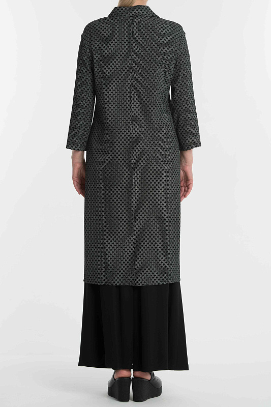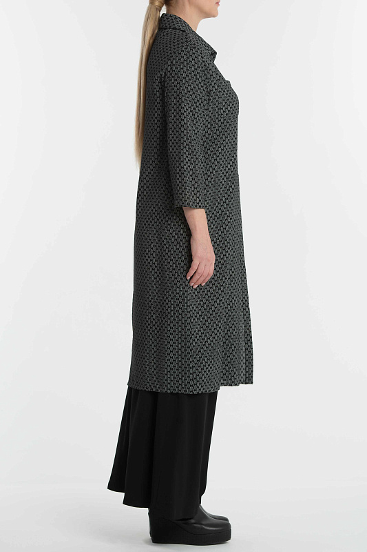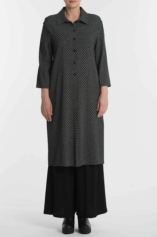 Длинная рубашка на пуговицах из вискозной ткани в клетку. Воротник отложной на стойке, на груди два накладных кармана, застёжка до талии.