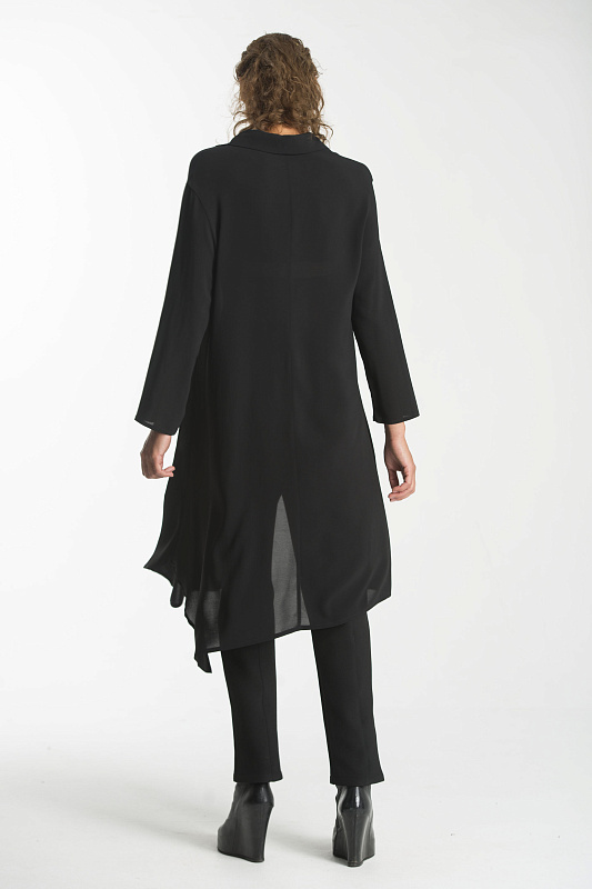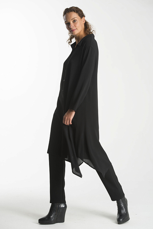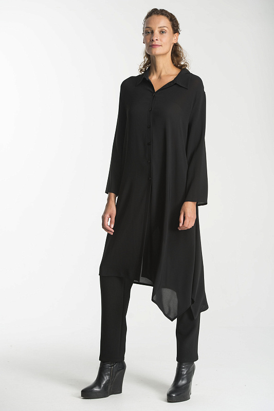 Блуза рубашка с отложным воротничком из эластичной вискозы и асимметричным низом. Застежка на пуговицах. Прекрасная основа для создания многослойных образов.