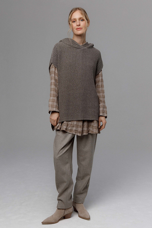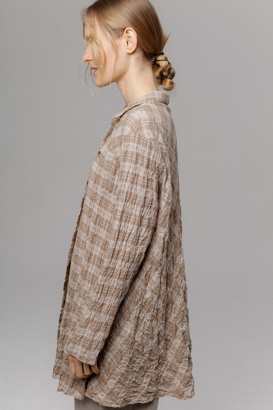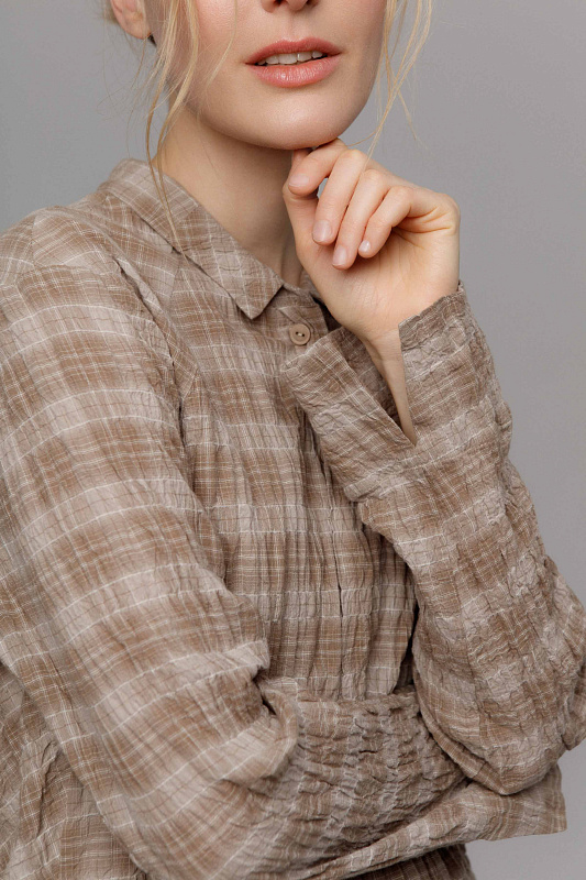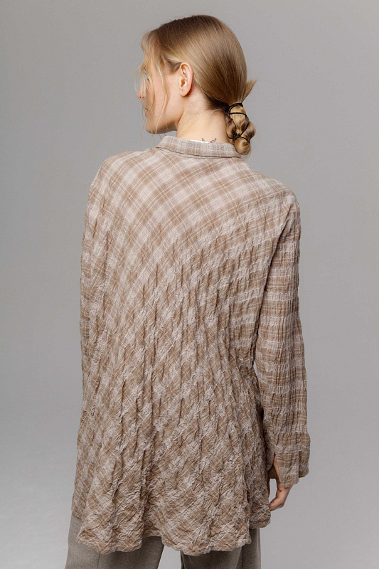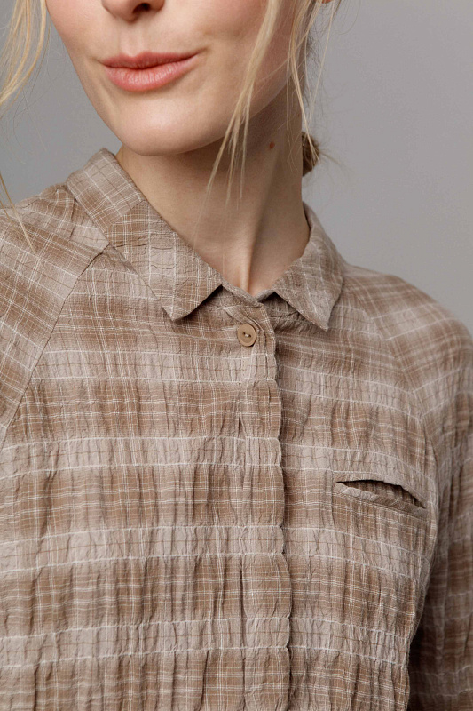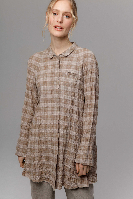 Комфортная, оригинального кроя блуза-рубашка в клетку выполнена из сжатого хлопка с добавлением эластана. Небольшой отложной воротничок. Застежка на маленькие пуговички, скрытые под планкой. Рукава реглан. По левой полочке фальшкарман.