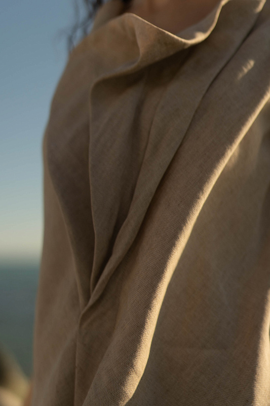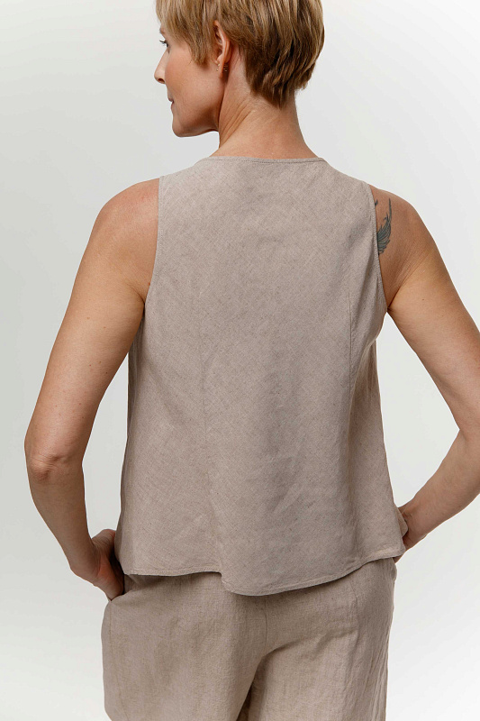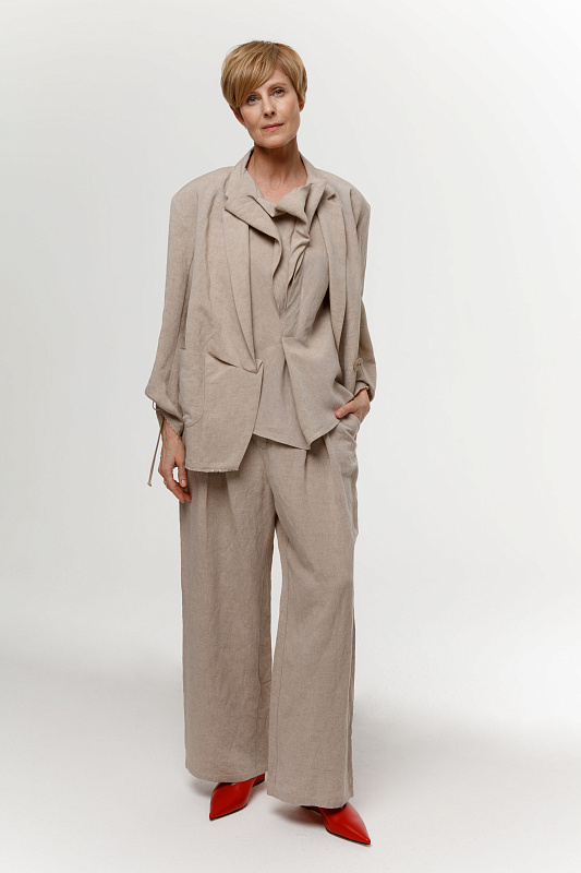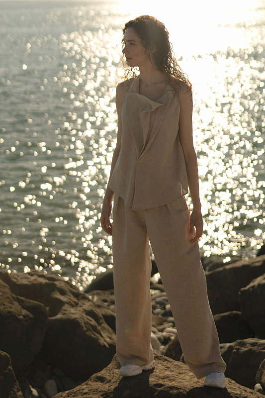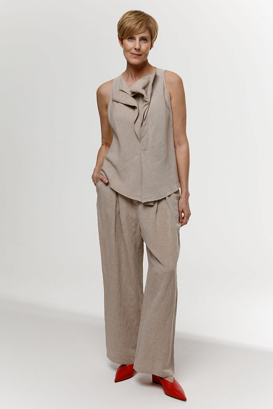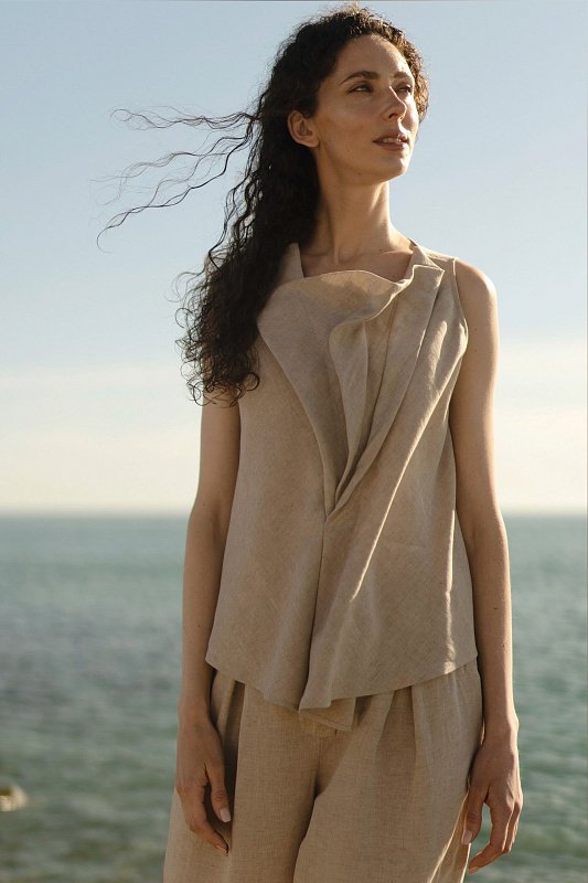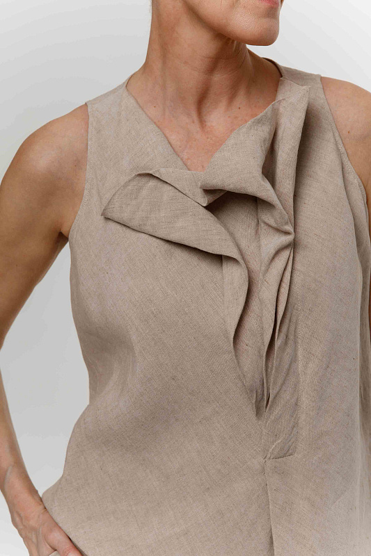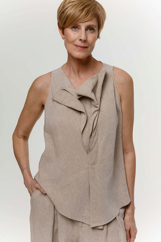 Эффектная блуза без рукавов с неравномерными, как бы случайно образованными складками - яркий акцент весенне-летней коллекции. Модель выполнена из фактурной вискозы с добавлением льна. Рекомендуем сочетать эту блузу с брюками или юбкой-брюками из такой же ткани.