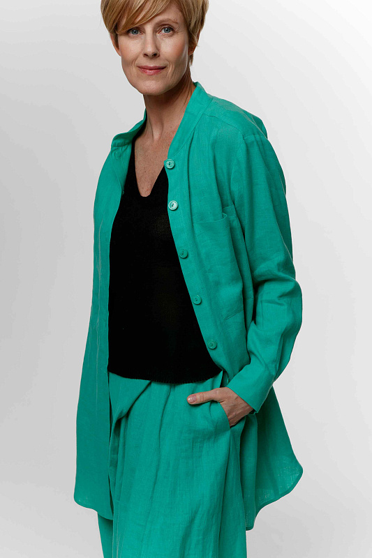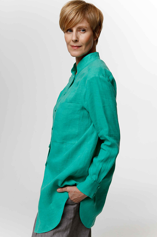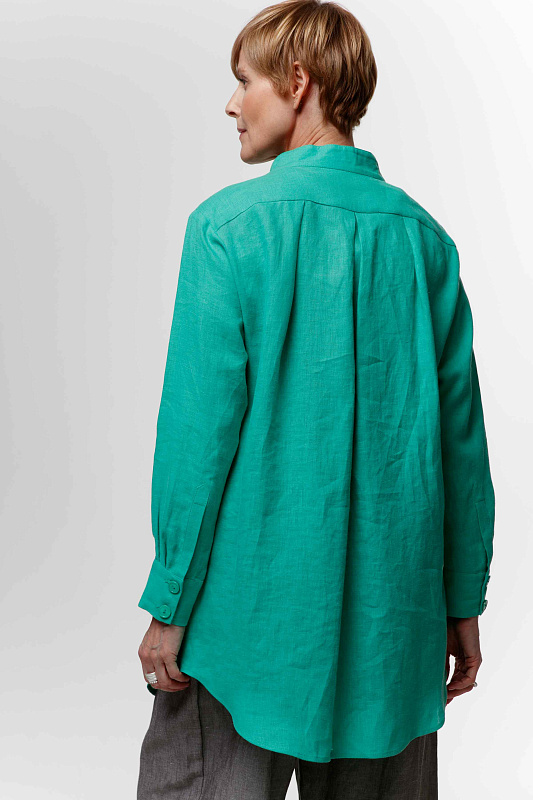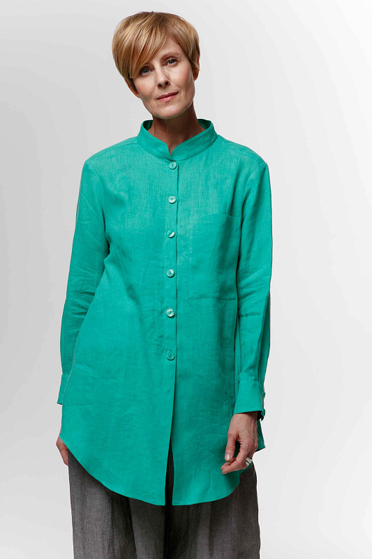 Эффектная удлиненная блуза с кокеткой по спинке. Накладной карман на левой полочке. Воротник - мягкая стойка. Застежка на пуговички, Рукава на манжетах.
