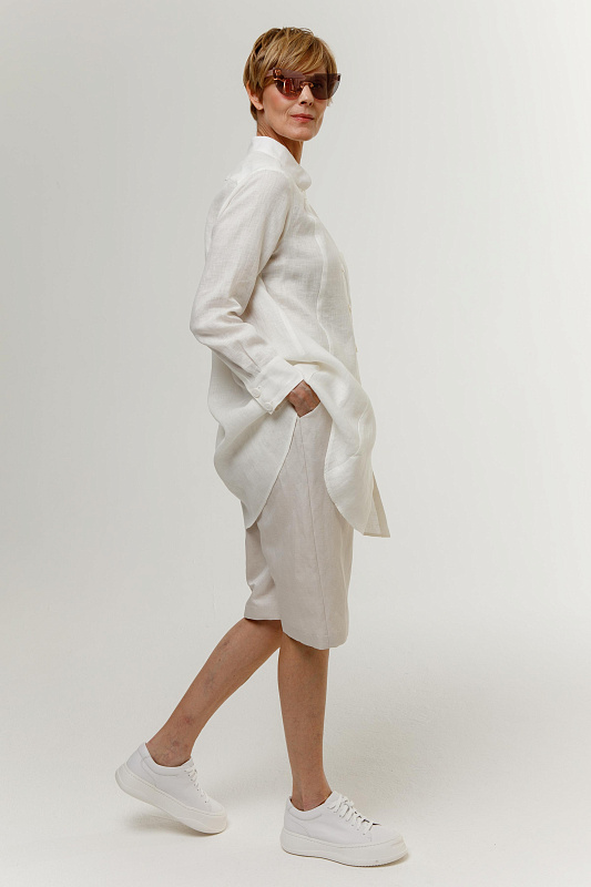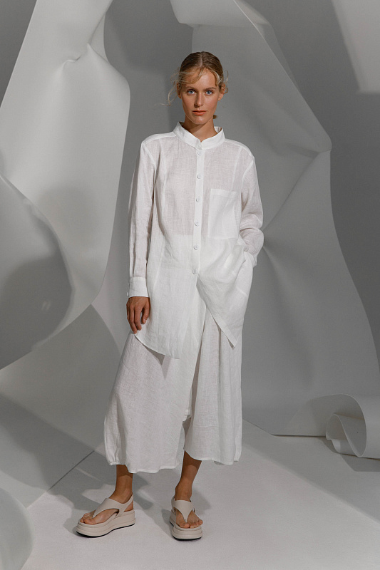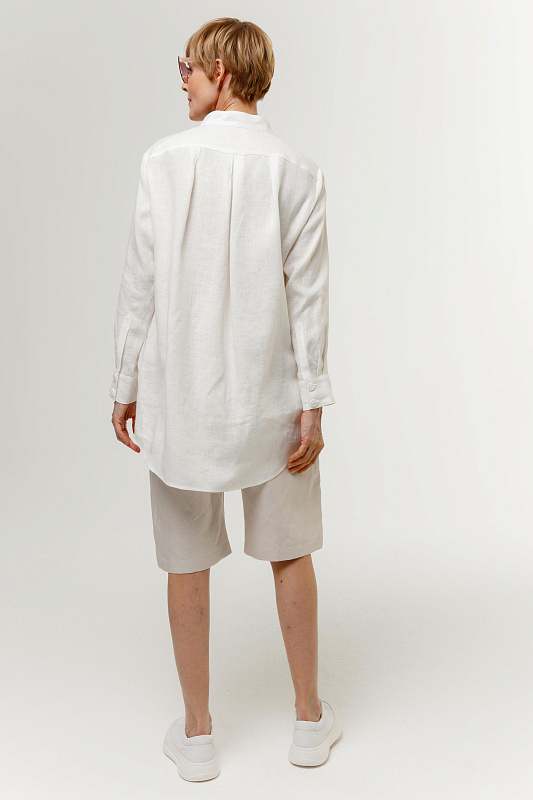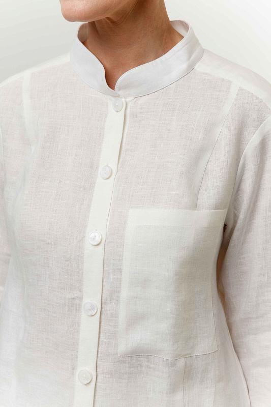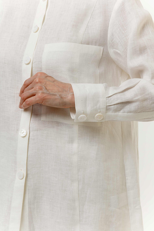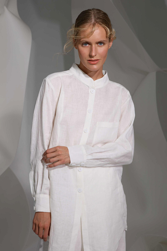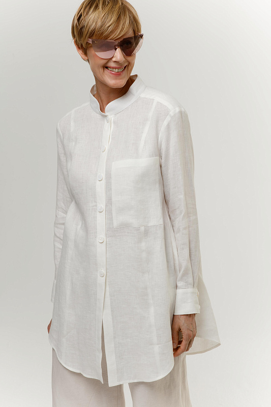 Эффектная удлиненная блуза с кокеткой по спинке. Накладной карман на левой полочке. Воротник - мягкая стойка. Застежка на пуговички, Рукава на манжетах.