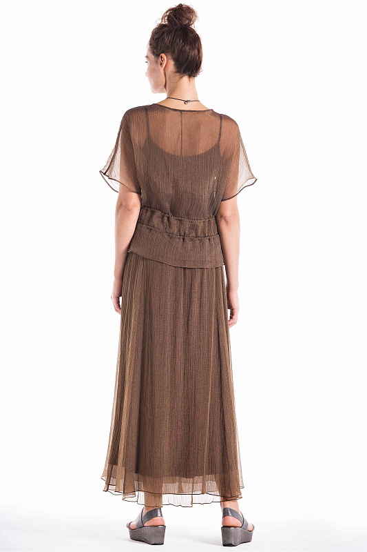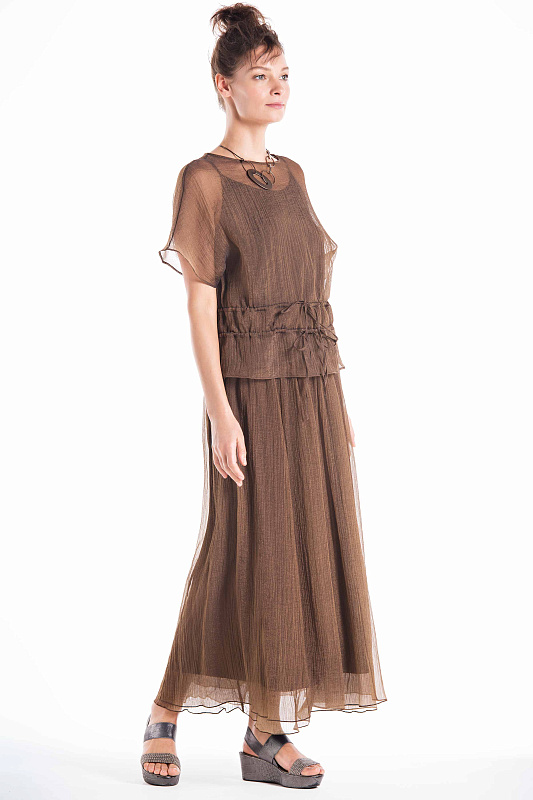 Блуза со спущенной линией проймы, круглым вырезом горловины и двумя кулисами по линии талии, позволяющими имитировать баску.
