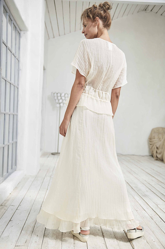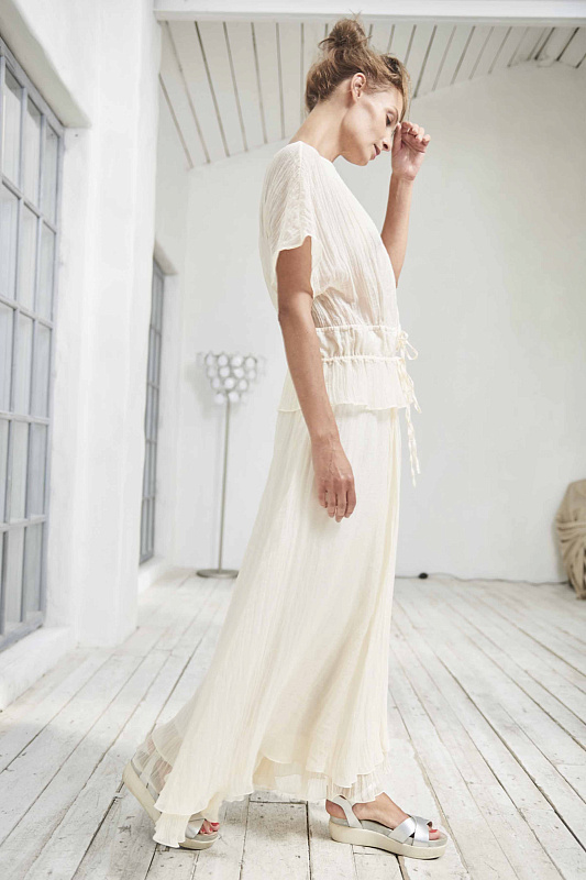 Блуза со спущенной линией проймы, круглым вырезом горловины и двумя кулисами по линии талии, позволяющими имитировать баску.