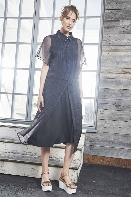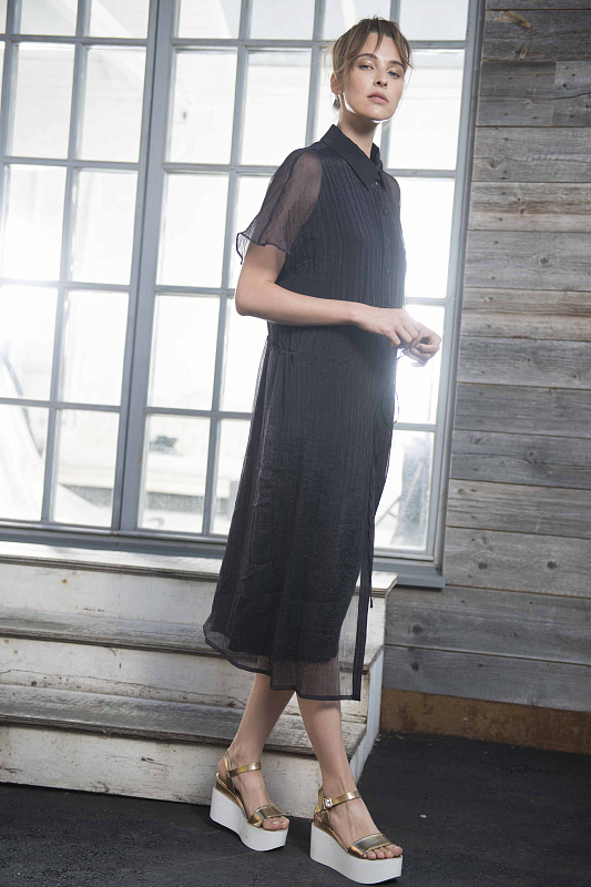 Длинная полупрозрачная блуза-рубашка с кулиской на талии, на пуговицах, отложной воротничок, прямой силуэт.