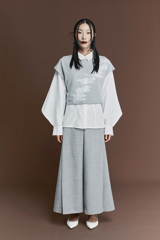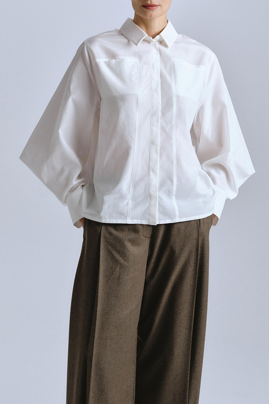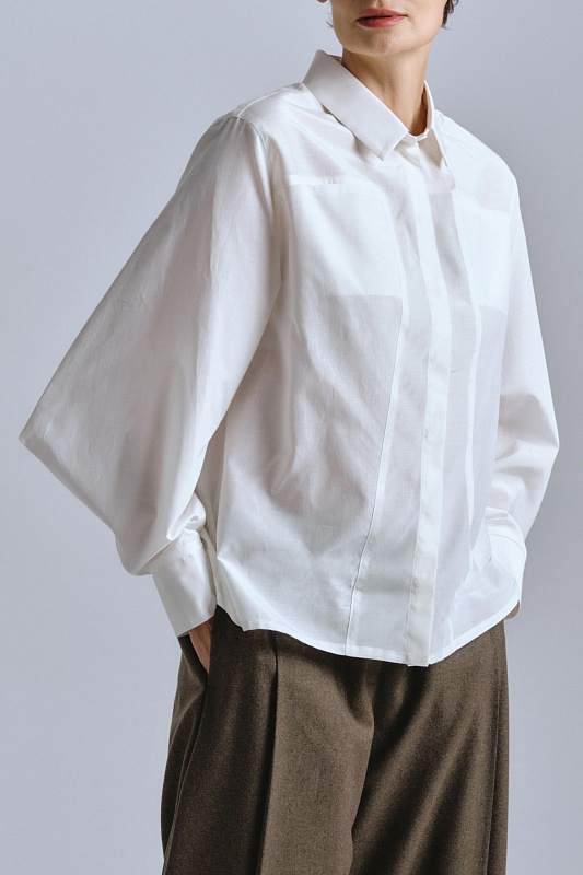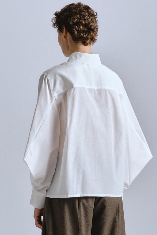 Блуза из вискозы и хлопка — идеальное сочетание новаторского дизайна и классической элегантности. Ее невозможно перепутать благодаря уникальным ромбовидным рукавам. Рукав скроен и вшит в манжет особым образом, создавая эффектную объемную форму ромба. Крой блузы универсальный, прямой. Воротник отложной рубашечного типа. Застежка на пуговицы, скрытые под планкой. Несколько дизайнерских приемов делают блузу исключительной: вертикальные строчки вдоль планки с пуговицами и горизонтальная, соединяющаяся с ней, накладные квадратные карманы образуют четкую геометрию. Элегантную посадку обеспечивают две встречные складки на кокетке по спине.