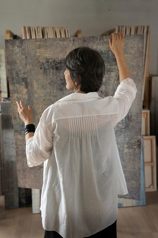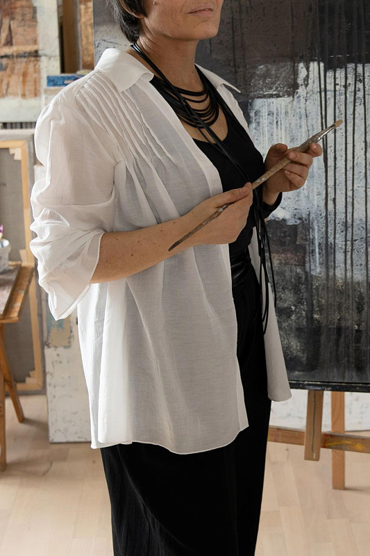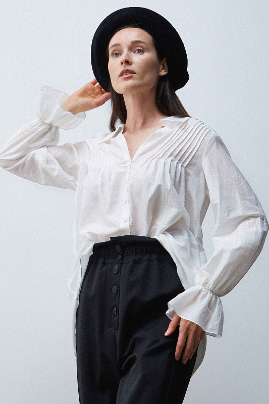 Воздушная блуза с оригинальными защипами по полочкам и спинке из микромодала с щелком. Блуза на кокетке. V-образный вырез. Рубашечный воротник на отрезной стойке. Блуза застегивается на изящные пуговки. Длинный рукав «епископ» на легкой резинке.
