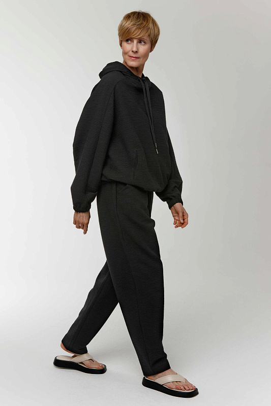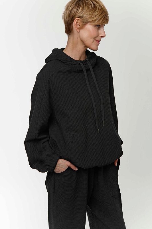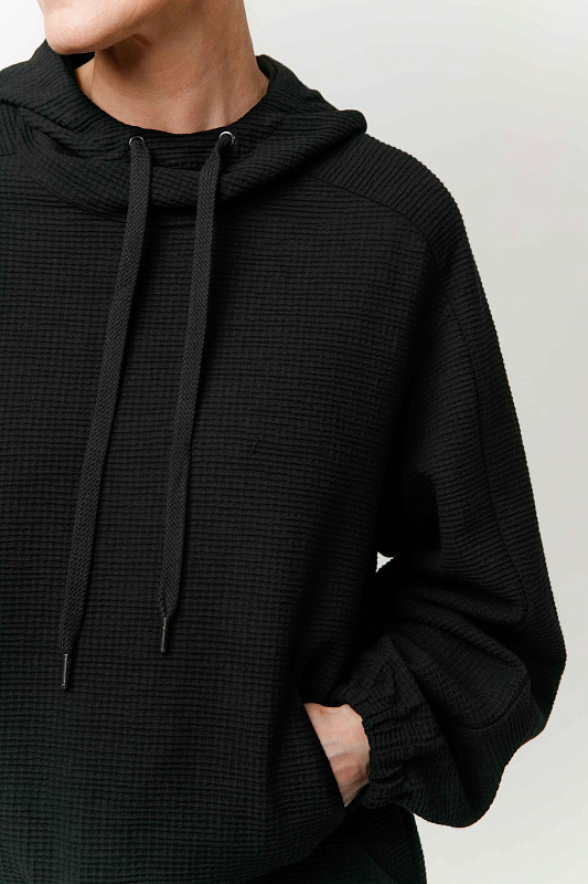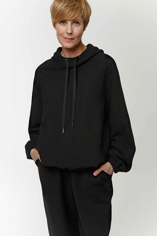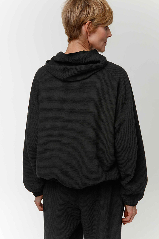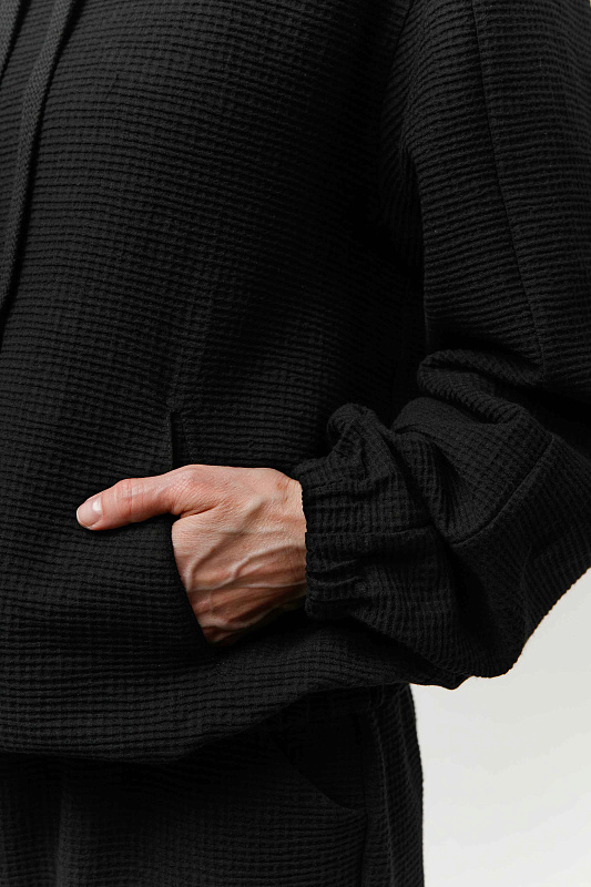 Динамичная блуза силуэта спорт-шик оригинальной дизайнерской конструкции. Модель выполнена из ячеистого хлопка с добавлением тенселя и эластана. Удобный капюшон-шлем на шнуровке. Два глубоких прорезных кармана. Низ блузы и рукава на мягкой деликатной резинке.