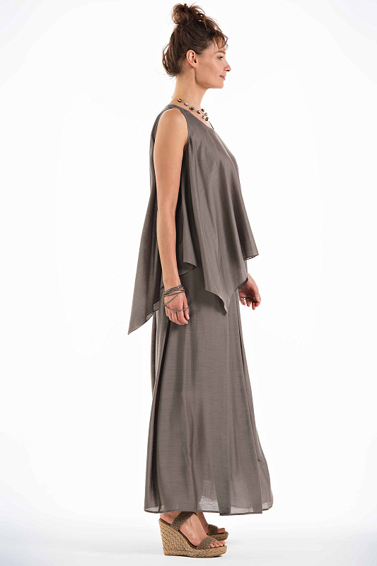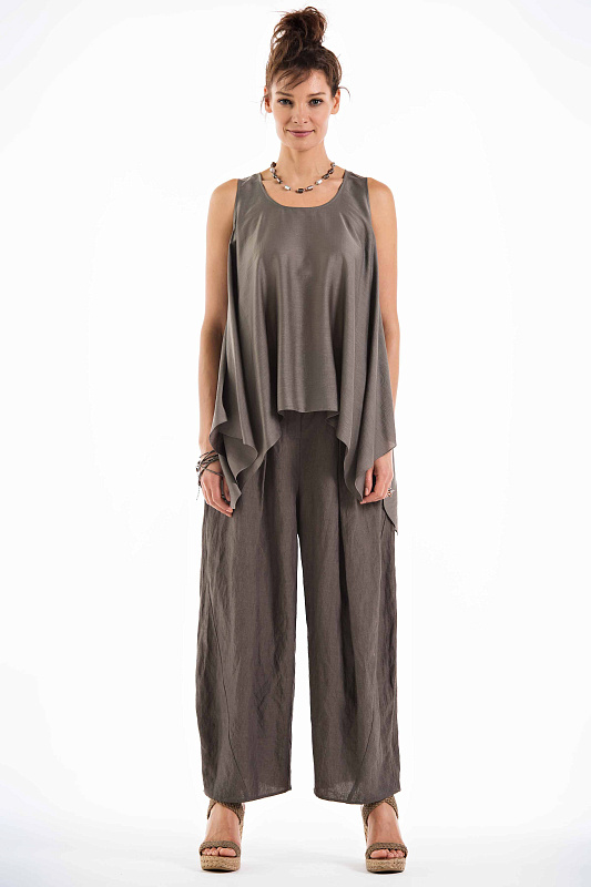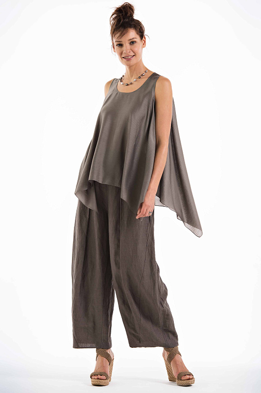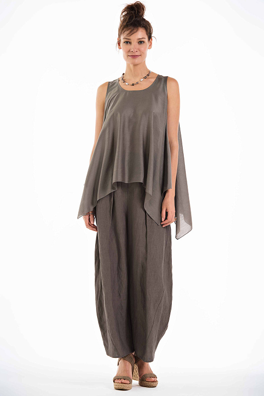 Свободный и легкий топ-клеш, без рукавов, асимметричный крой низа придает летящий сводобный эффект, с круглым вырезом горловины. Длина по спинке 58см.