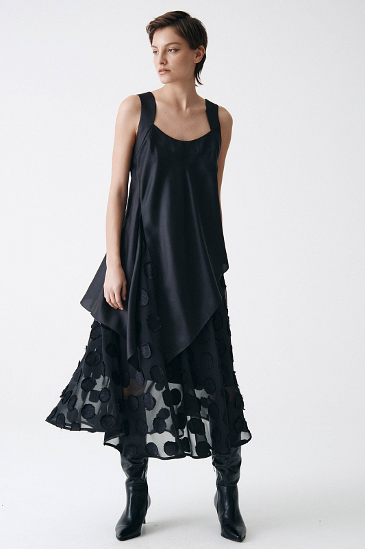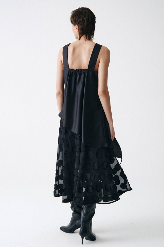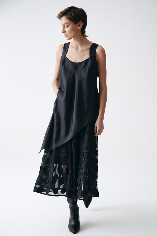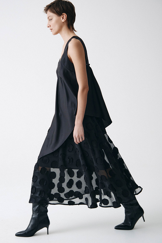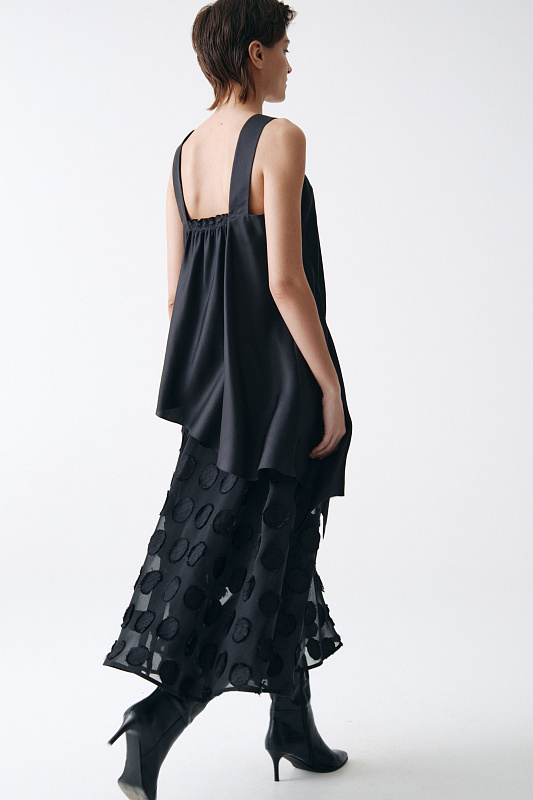 Удлиненный топ из 100% премиального шелка с благородным блеском. Дизайн со смещенной ассиметричной линией подола и бретелями — это баланс небрежности и точного кроя. Спереди открытое декольте. Для создания эластичных сборок и усиления прилегания к телу, сзади вставлена нить -резинка. Топ выглядит легко и дерзко одновременно. Комбинируйте его так же дерзко, подчеркивая уникальность и роскошь вещи.