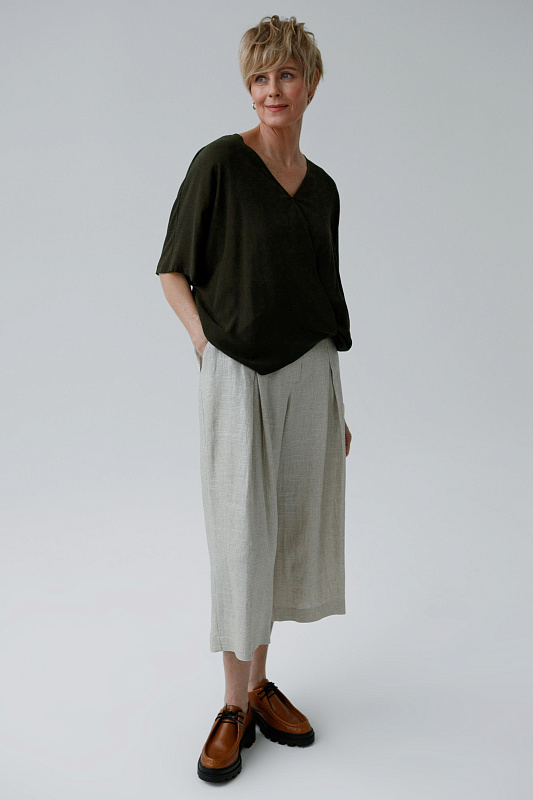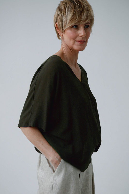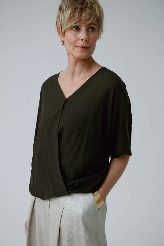 Оригинальная блуза-трансформер. Первый вариант - носить блузу с запахоми, при котором одна полочка перекрывает другую и фиксируется сбоку. Запах образует на блузе V-образный вырез, который хорошо подчёркивает шею. Другой вариант - не застегивать пуговички по низу изделия, тогда блуза становится силуэта квадрат.