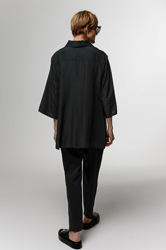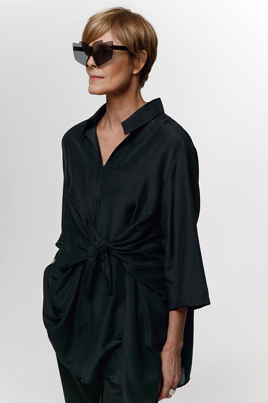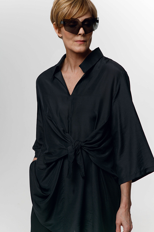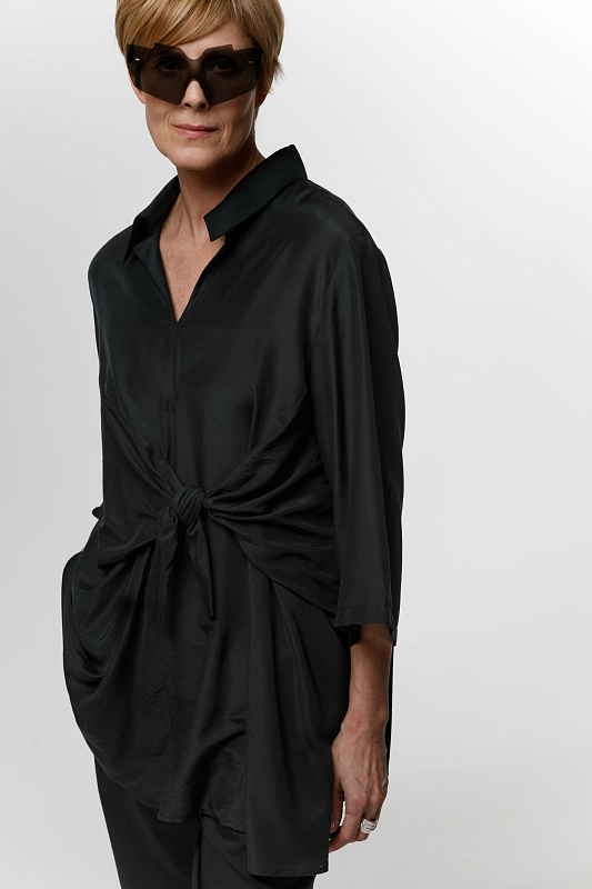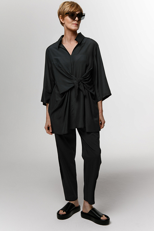 Блуза-туника оригинальной дизайнерской конструкции из микромодала и шелка. Тончайшая и невесомая ткань имеет легкий матовый блеск, приятна на ощупь и хорошо пропускает воздух. Туника имеет V-образный вырез и отложной воротник. Приспущенная линия плеч и свободные, укороченные рукава дарят ощущение расслабленности, а эффектная завязка-узел визуально уравновешивает пропорции.