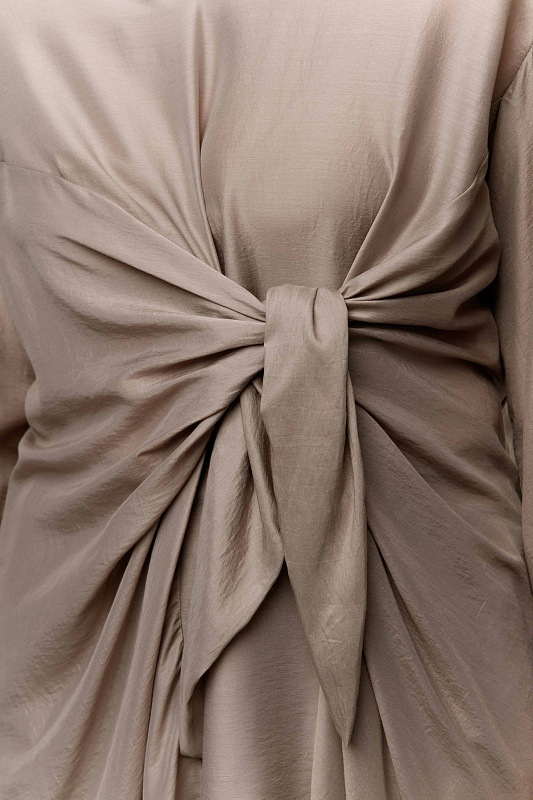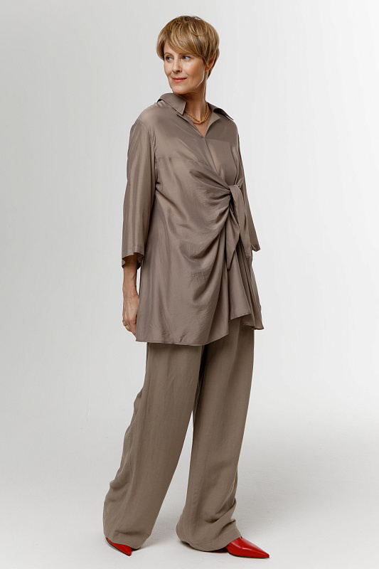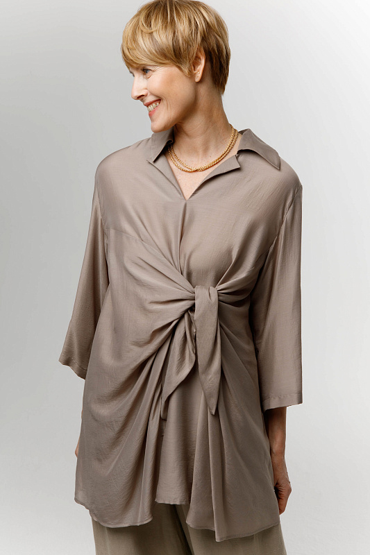 Блуза-туника оригинальной дизайнерской конструкции из микромодала и шелка. Тончайшая и невесомая ткань имеет легкий матовый блеск, приятна на ощупь и хорошо пропускает воздух. Туника имеет V-образный вырез и отложной воротник. Приспущенная линия плеч и свободные, укороченные рукава дарят ощущение расслабленности, а эффектная завязка-узел визуально уравновешивает пропорции.