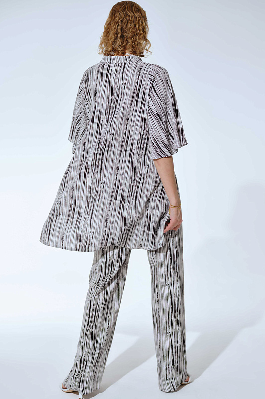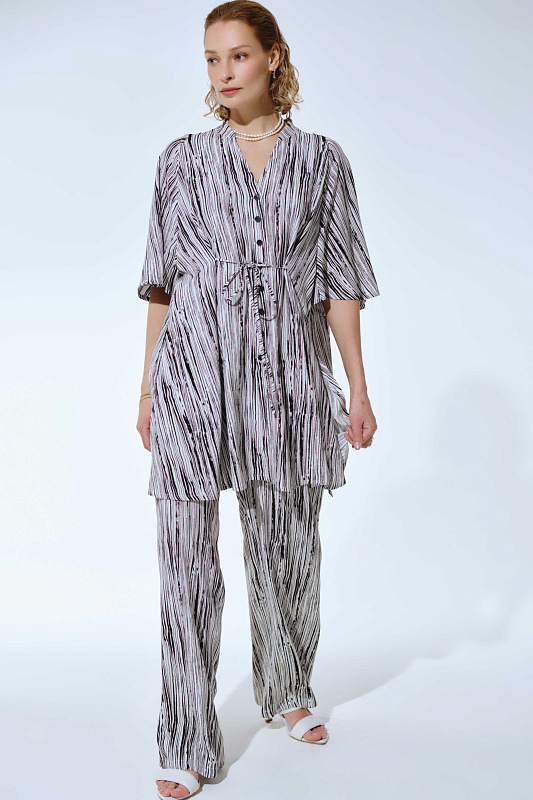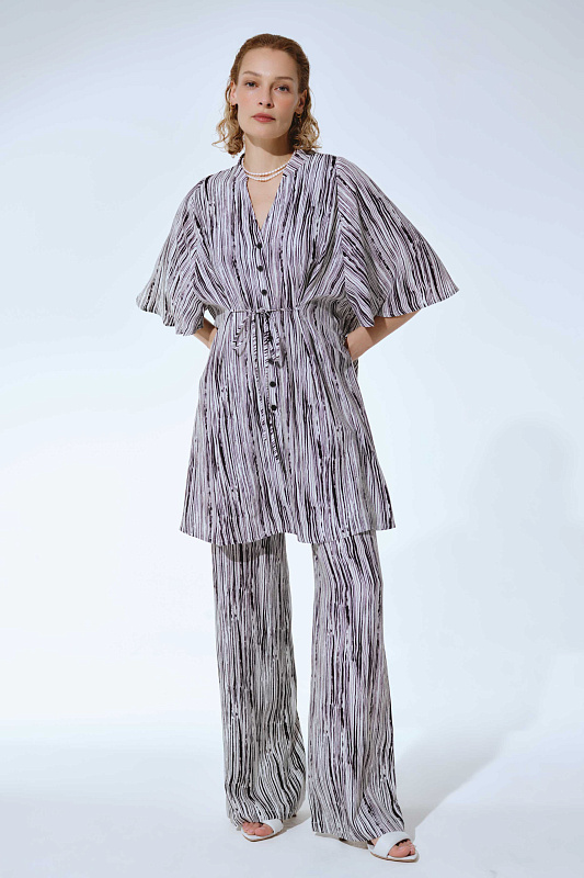 Вискозная туника свободного расслабленного силуэта с нерегулярным рисунком в виде вертикальных неравномерных штрихов. Застежка на маленькие пуговички. Мягкая стойка , переходящая в V-образный вырез. Летящие рукава-реглан. Глубокие боковые разрезы. Подчеркнуть талию можно с помощью тонких шнурков. .