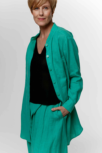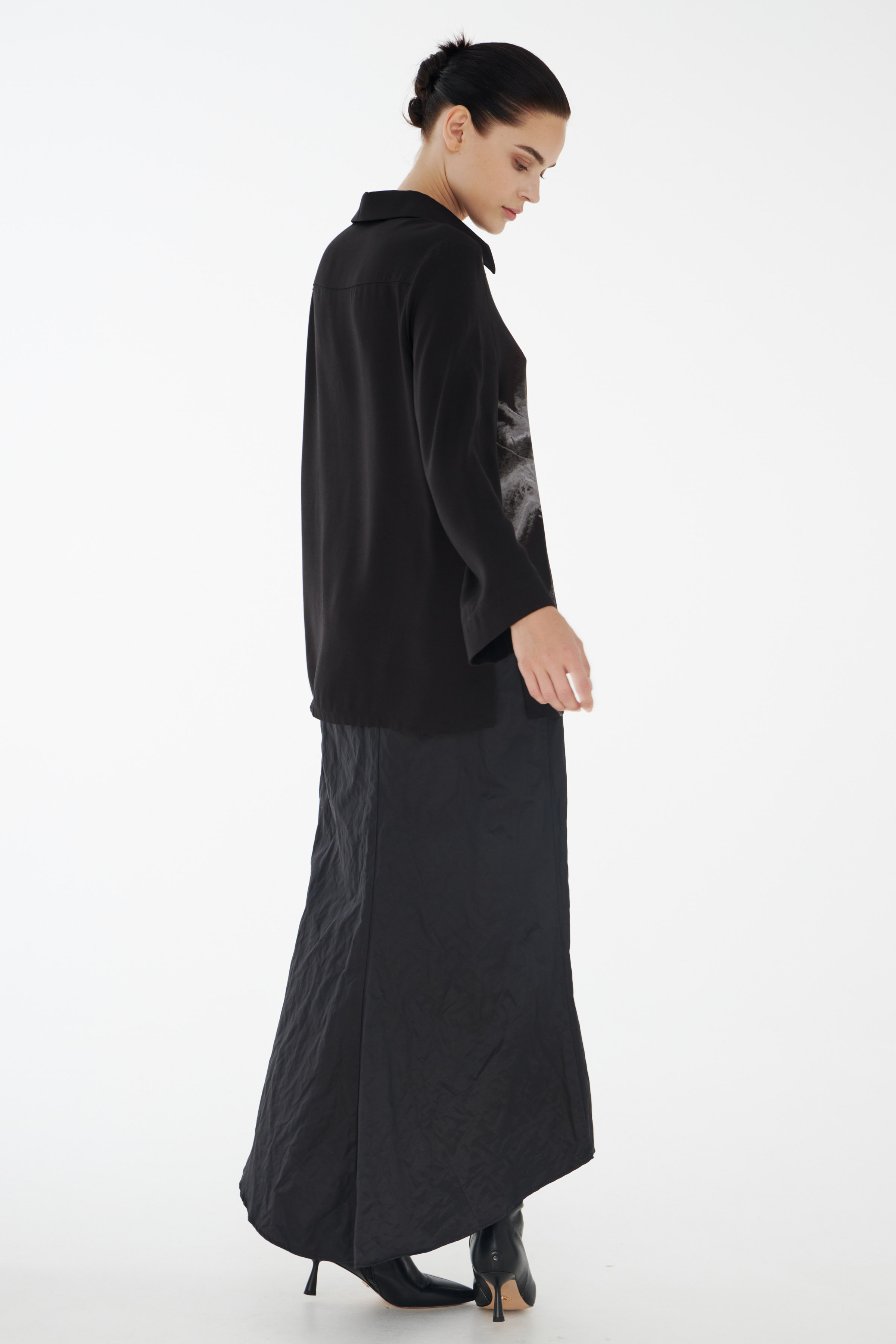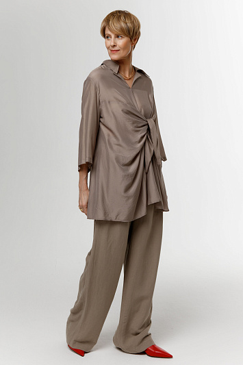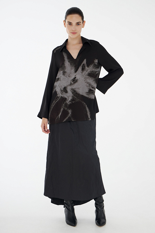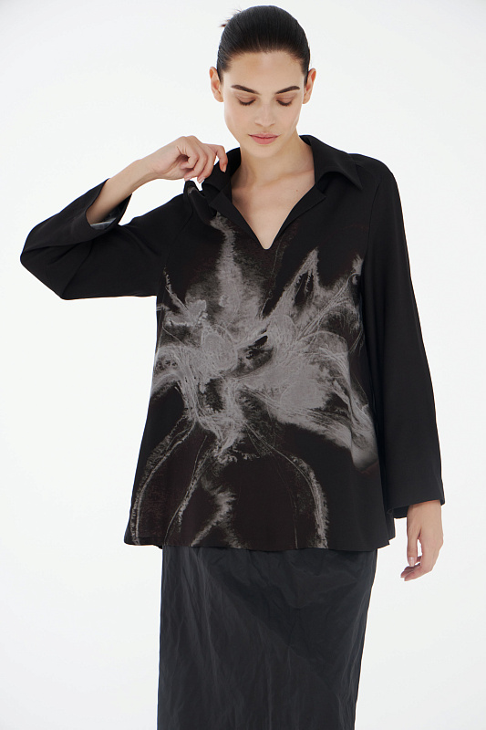 Полюбившаяся дизайнерам вискоза была выбрана для очередного эксклюзива. Блуза - туника А-силуэта с длинными рукавами, V-образным вырезом и отложным воротником на стойке. Акцентный декоративный элемент- разрезы по бокам. Авторский принт придает модели утонченности и немного загадочности. Приятная на ощупь, струящаяся ткань стала идеальным полотном для выразительного, абстрактного цветка, украшающего блузу.