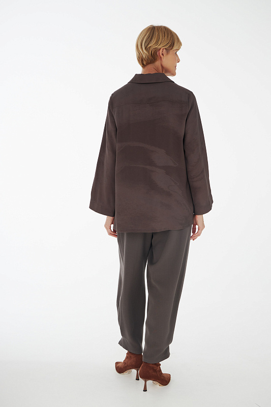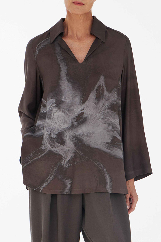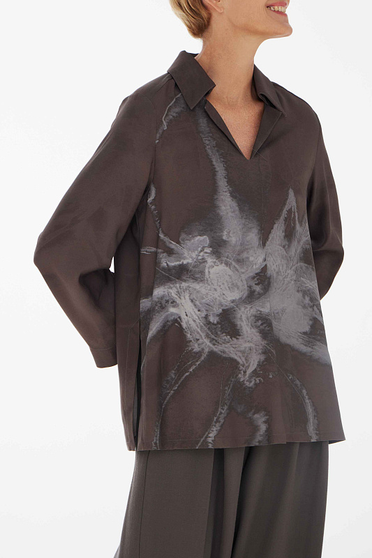 Полюбившаяся дизайнерам вискоза была выбрана для очередного эксклюзива. Блуза - туника А-силуэта с длинными рукавами, V-образным вырезом и отложным воротником на стойке. Акцентный декоративный элемент- разрезы по бокам. Авторский принт придает модели утонченности и немного загадочности. Приятная на ощупь, струящаяся ткань стала идеальным полотном для выразительного, абстрактного цветка, украшающего блузу.