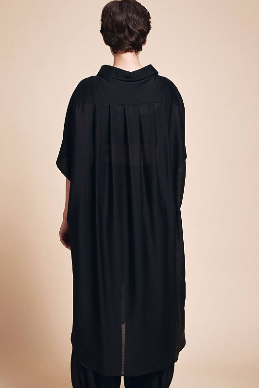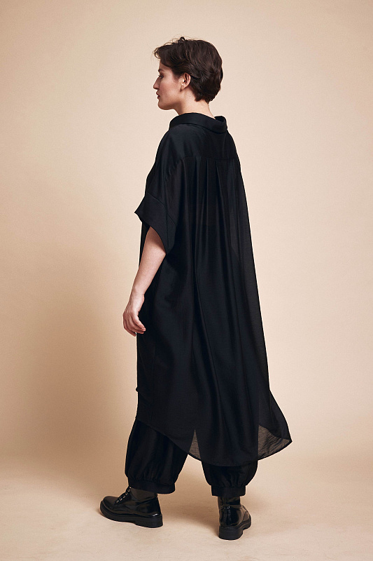Блуза-туника с асимметричным воротником сложной дизайнерской конструкции, на потайной застежке, с кокеткой и складками по спинке. Экологичная ткань нового поколения микромодал с добавлением шелка.