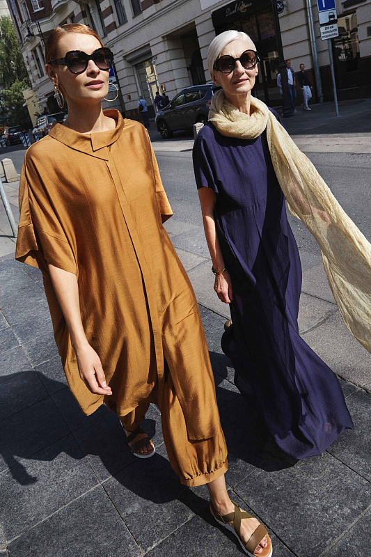 Блуза-туника с асимметричным воротником сложной дизайнерской конструкции, на потайной застежке, с кокеткой и складками по спинке. Экологичная ткань нового поколения микромодал с добавлением шелка.