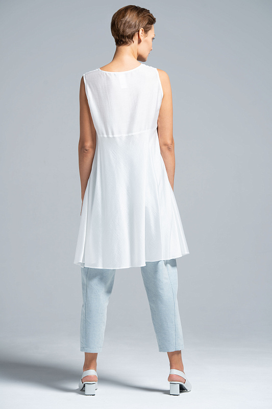 Свободная воздушная шелковая блуза с круглым вырезом горловины и удлиненной спинкой. Блуза оригинальной дизайнерской конструкции с удлиненной спинкой, переходящей в полочку по боковому шву, без рукавов. Длина по спинке 93 см.