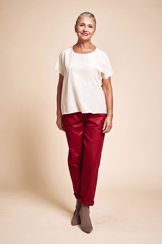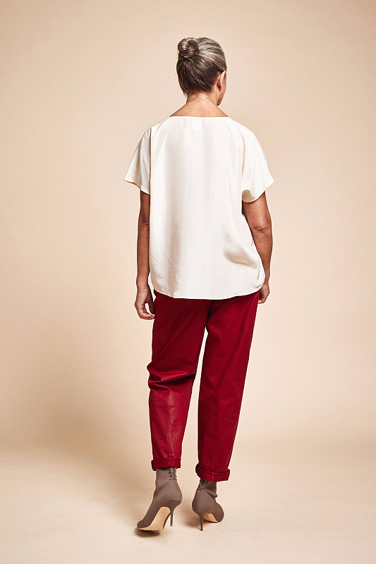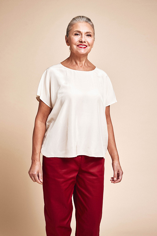 Блуза прямого силуэта с круглым вырезом горловины. Экологичная ткань нового поколения микромодал с добавлением шелка.