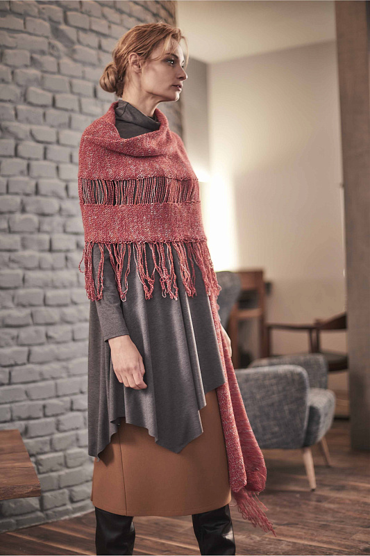 Трикотажная вискозная туника с цельнокроеным воротником стойка и асимметричным низом.