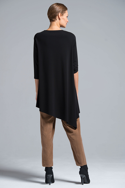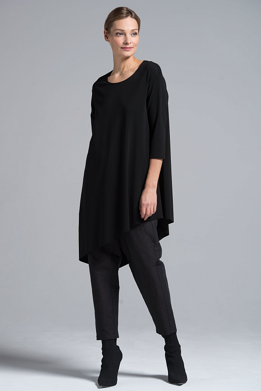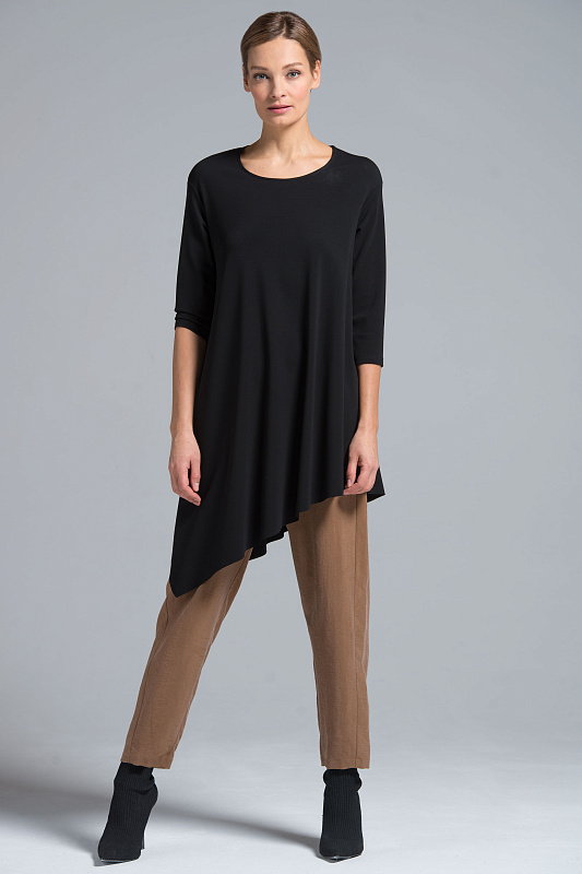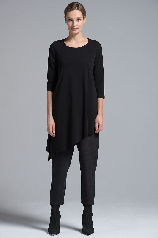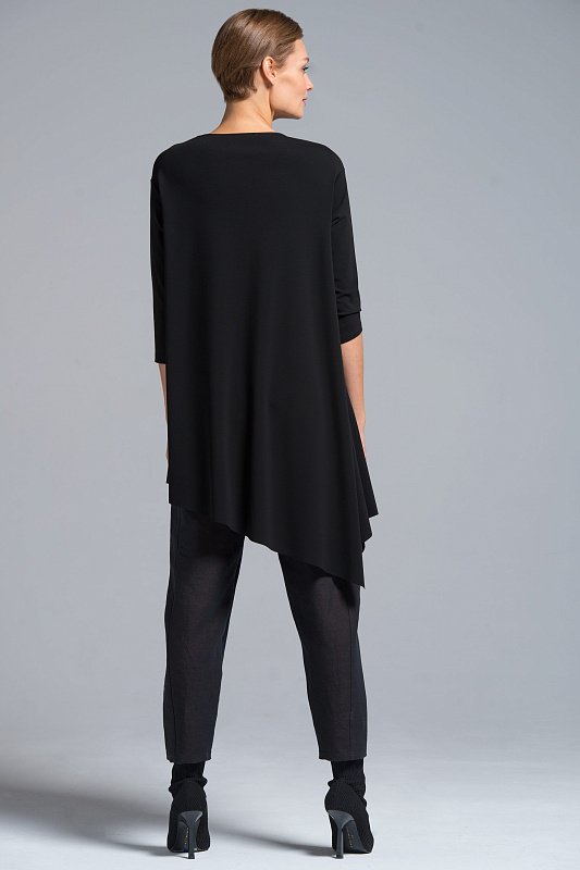 Топ-база с втачным рукавом 3/4 и круглым вырезом горловины. Оригинальный слегка расклешенный силуэт с асимметричным диагональным низом, удлиненным по правой стороне. Плотный вискозный эластичный джерси.