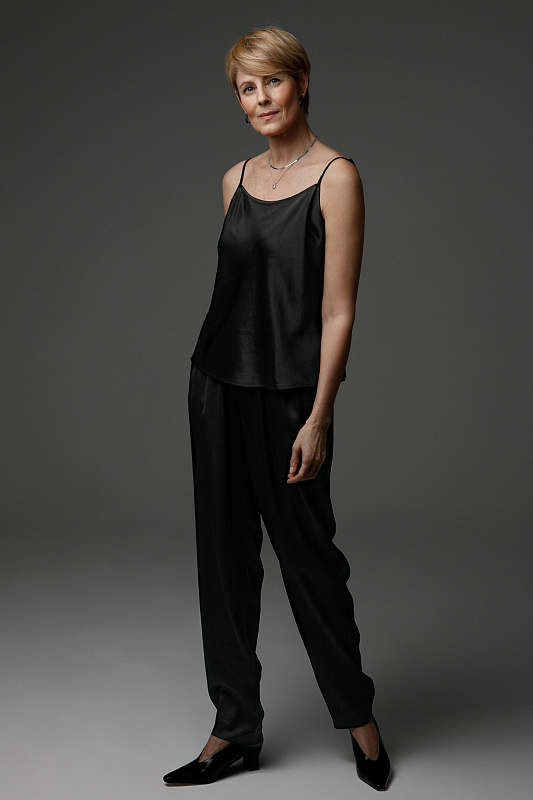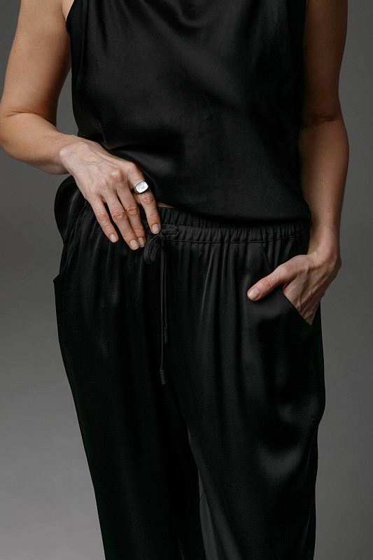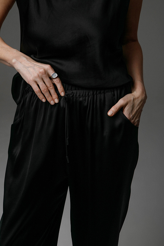 Вальяжные брюки-джоггеры из плотной струящейся вискозы с эластаном. Пояс на резинке и на тонком декаративном шнурке. Карманы с отрезным бочком.