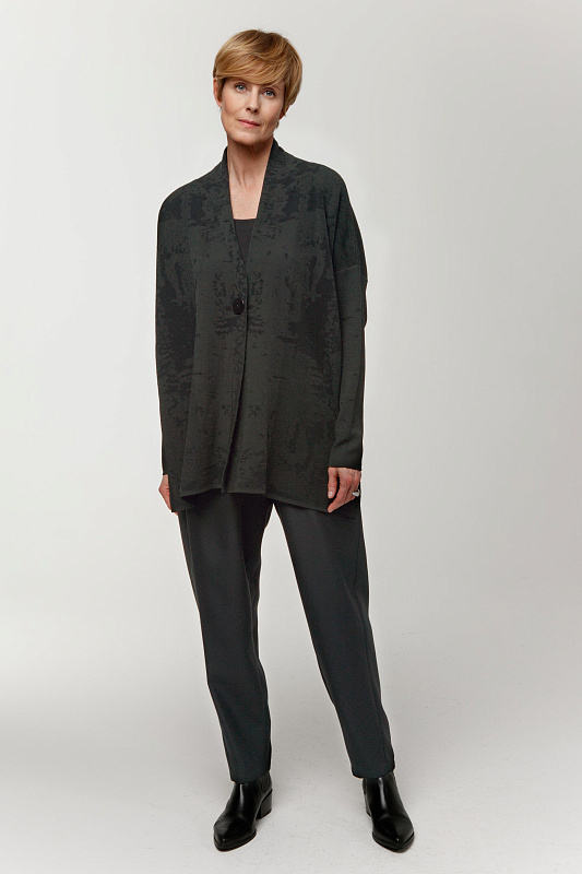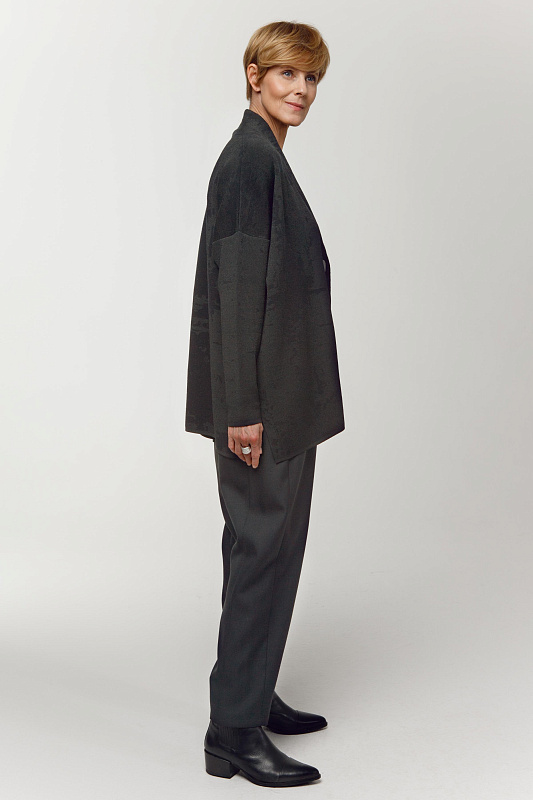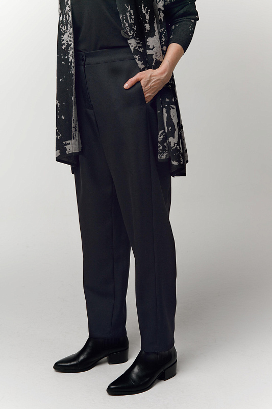 Базовые полуприлегающие брюки-«бананы» из тонкой гладкой шерсти, которая согреет в холода и одновременно будет комфортна в помещении. Высокая посадка выгодно корректирует силуэт. Оригинальный крой стройнит и визуально удлиняет ноги. Максимально удобные внутришовные карманы, пояс брюк на резинке и на пуговице. По низу можно сделать стильный отворот, либо носить в классической интерпретации в офис или на деловые встречи.