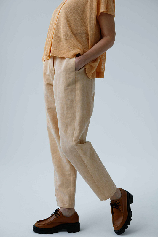 Брюки оригинальной дизайнерской конструкции изо льна с добавлением хлопка и эластана. Удобная высокая посадка, карманы с отрезным бочком, застежка - пуговица, сзади резинка, по бокам лампасы.