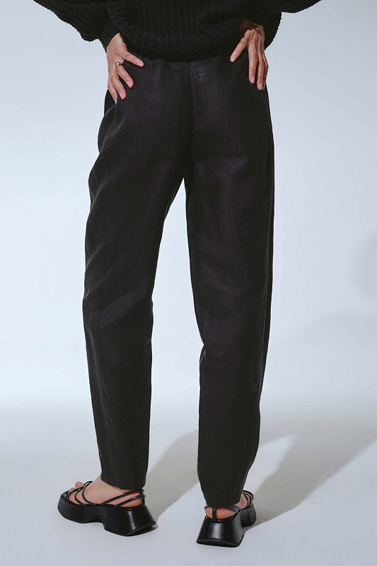 Базовые брюки изо льна силуэта бананы. Пояс сзади на резинке. Застежка на молнию и пуговичку. Карманы с отрезным бочком. Сзади два накладных кармана.