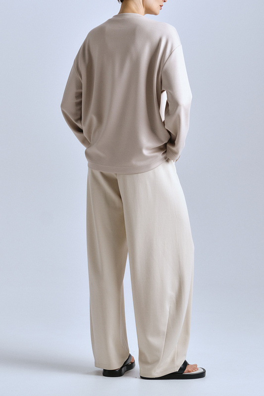 Модель брюк, которая имеет свободный крой в области бёдер и зауженный низ. Брюки выполнены из мягкого трикотажа джерси, который невероятно приятен тактильно и обеспечивает комфорт при носке. Задняя кокетка не только акцентная деталь, но и дизайнерский прием для правильной посадки модели. Эластичная резинка со шнурком на поясе, а также удобные карманы дополняют модель для создания удобных, но при этом стильных и универсальных образов в стиле спорт-шик.