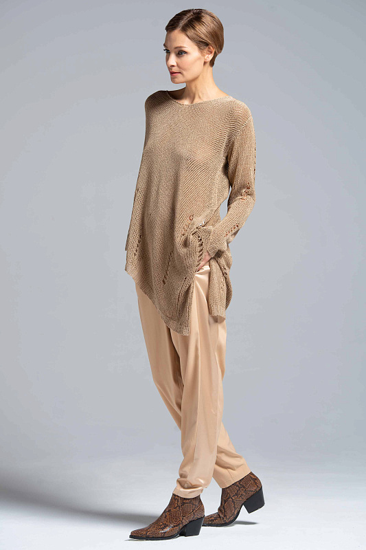Брюки полуприлегающего узкого силуэта с лампасами, с внутришевными карманами, пояс брюк на резинке и на пуговице. Ткань - нежная и легкая вискоза. Благодаря содержанию в ткани эластана брюки прекрасно сидят по фигуре. Длина изделия по боковому шву 102 см.