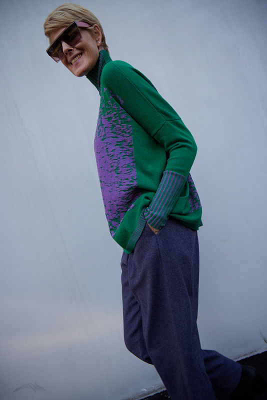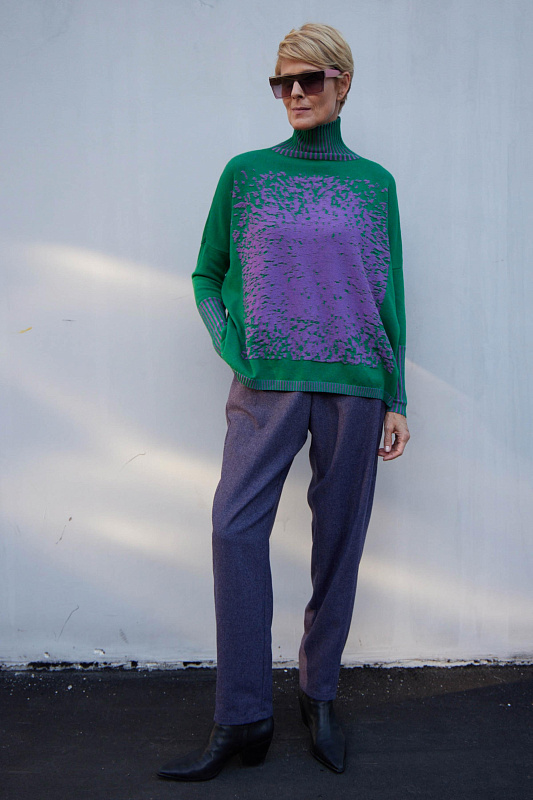 Брюки оригинальной дизайнерской конструкции из мягкой шерстяной ткани твил силуэта «бананы» с внутришовными карманами. Удобная высокая посадка, застежка на молнии и пуговице, пояс сзади на резинке.