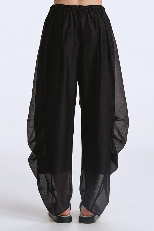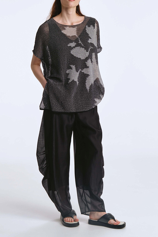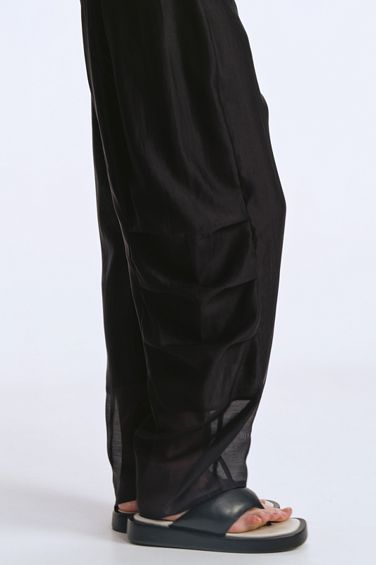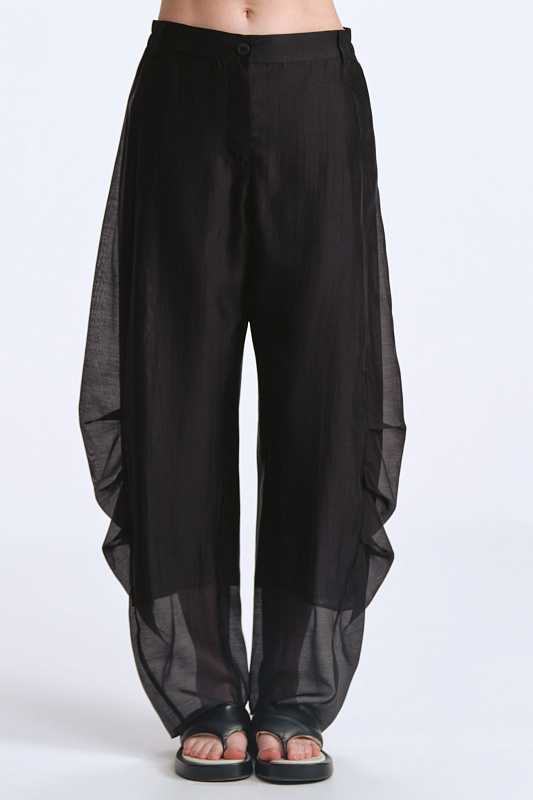 Эти брюки — мастерское сочетание откровенности и элегантности. Прозрачная ткань играет с силуэтом, а подкладка чуть ниже колена добавляет интригующей многослойности. Модель трендового свободного кроя, зауженная к низу. Защипы-складки во внешнем боковом шве усиливают силуэт овал. Такой крой от дизайнеров LESEL делает брюки уникальными. Пояс на резинке сзади мягко облегает талию, не сковывая движений. Молния с пуговицей спереди фиксирует брюки по фигуре. Карманы сохраняют практичность. Каждая деталь этих брюк — это намек на вашу уверенность.