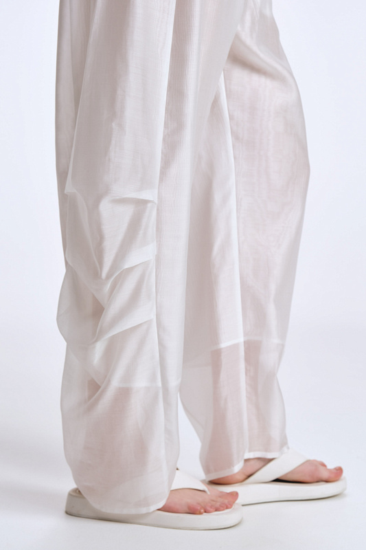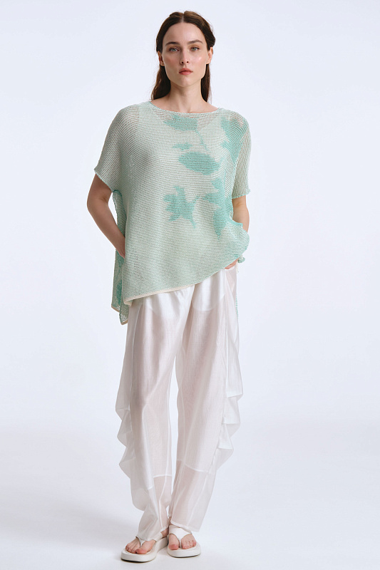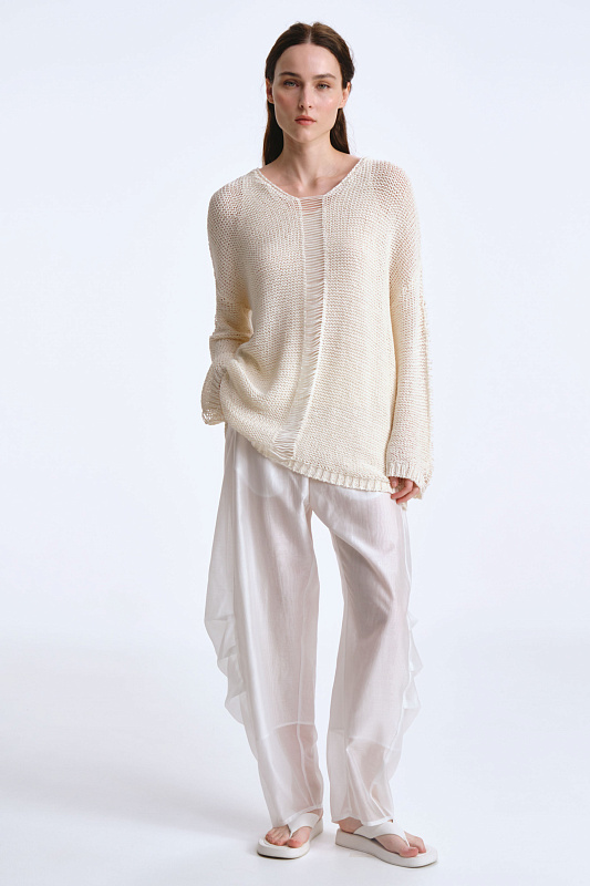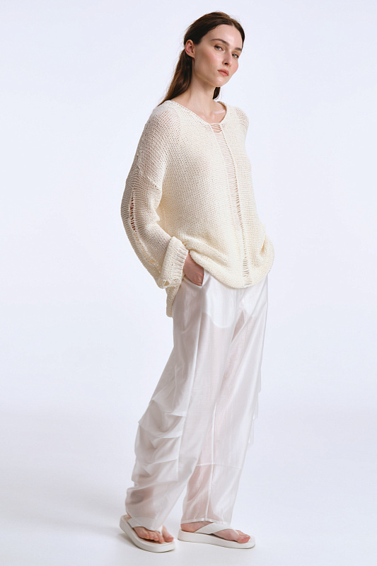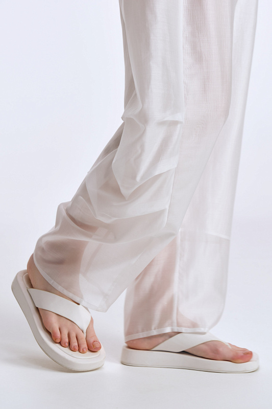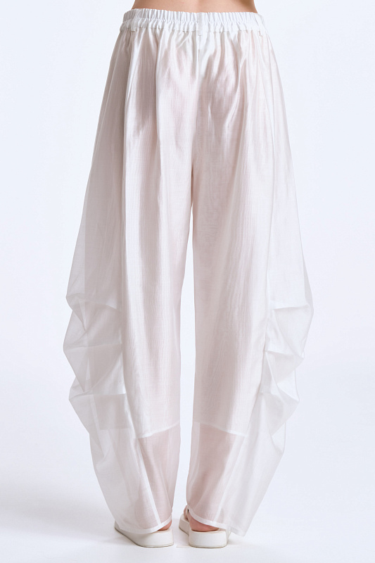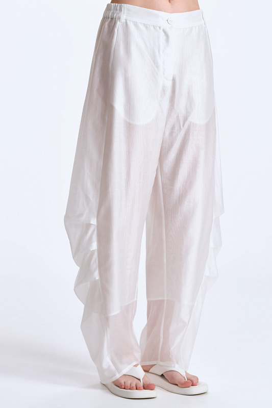 Эти брюки — мастерское сочетание откровенности и элегантности. Прозрачная ткань играет с силуэтом, а подкладка чуть ниже колена добавляет интригующей многослойности. Модель трендового свободного кроя, зауженная к низу. Защипы-складки во внешнем боковом шве усиливают силуэт овал. Такой крой от дизайнеров LESEL делает брюки уникальными. Пояс на резинке сзади мягко облегает талию, не сковывая движений. Молния с пуговицей спереди фиксирует брюки по фигуре. Карманы сохраняют практичность. Каждая деталь этих брюк — это намек на вашу уверенность.