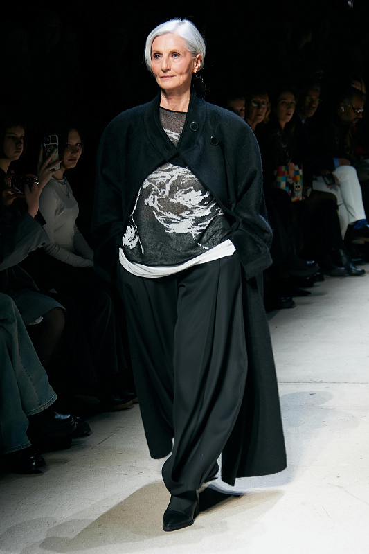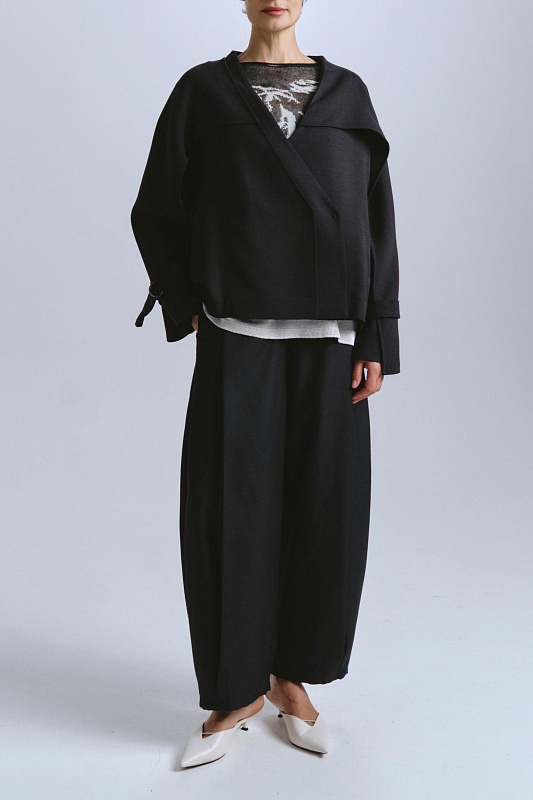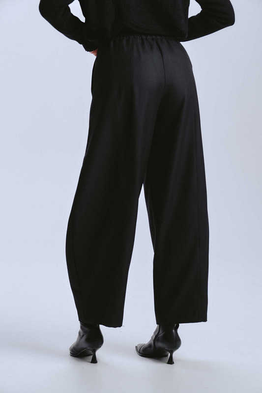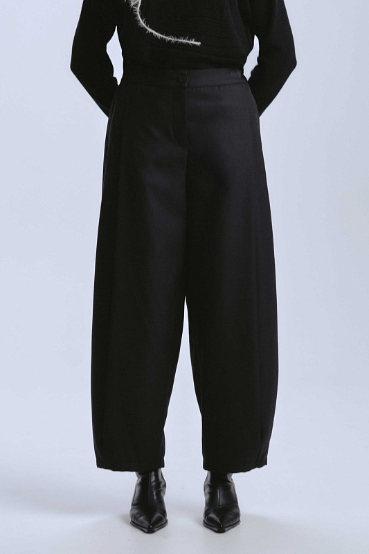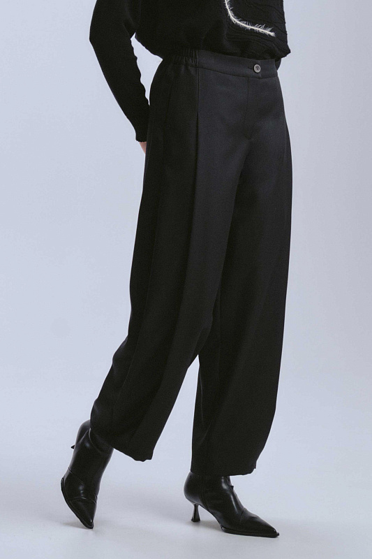 Эти брюки станут главным элементом образа. Глубокая фронтальная складка, формирующая ширину брюк, застрочена к низу, обеспечивает плавное элегантное сужение к щиколотке. Этот прием визуально подчеркивает ромбовидную форму. Застежка молния с пуговицей спереди и эластичная резинка сзади максимально удобна. Удобные прорезные карманы аккуратно вшиты в боковые швы. Брюки без подкладки. Смесовая ткань, в составе которой 55% шерсти, обеспечивает тепло, комфорт, хорошую драпируемость и способность держать форму.