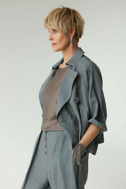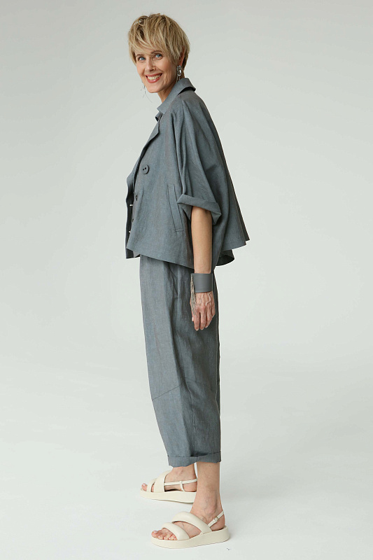 Брюки бриджи оригинальной дизайнерской кострукции силуэта ромб. Застежка на пуговицах, пояс сзади на резинке. Два удобных глубоких кармана. Модель выполнена изо льна с добавлением вискозы.