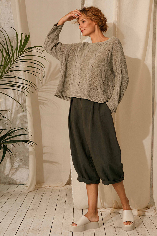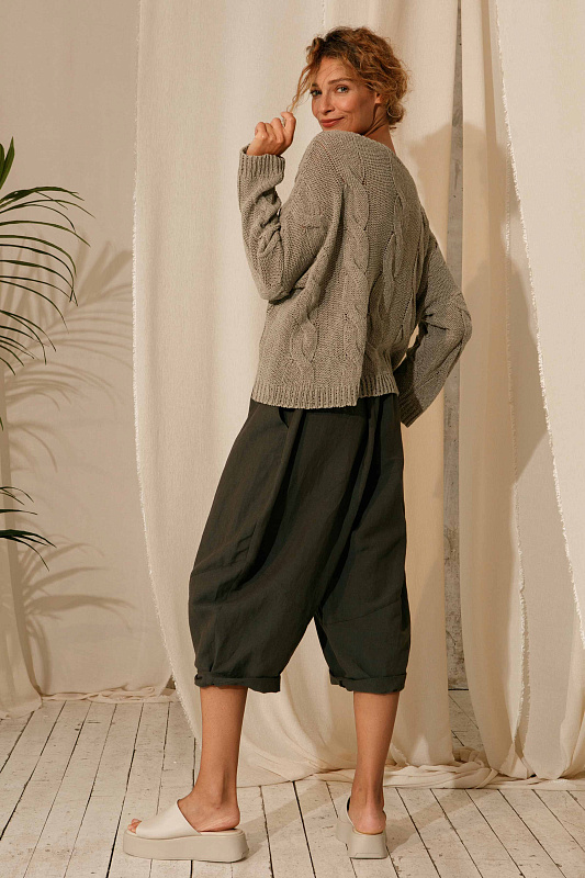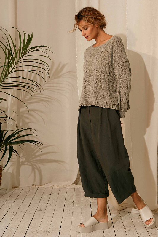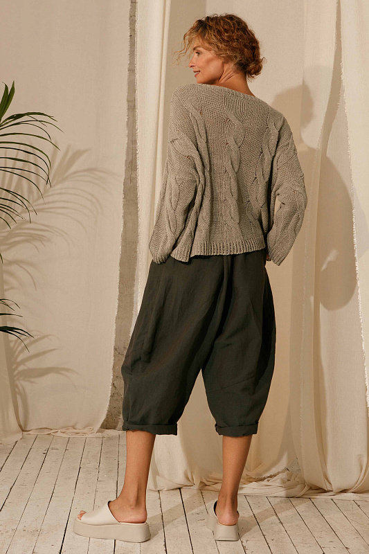 Брюки бриджи оригинальной дизайнерской кострукции силуэта ромб. Застежка на пуговицах, пояс сзади на резинке. Два удобных глубоких кармана. Модель выполнена изо льна с добавлением вискозы.