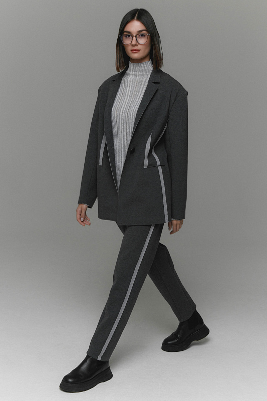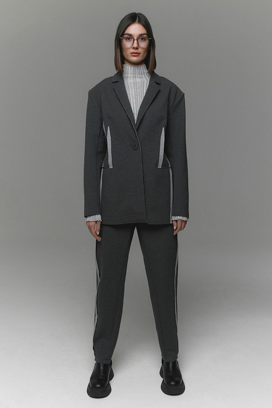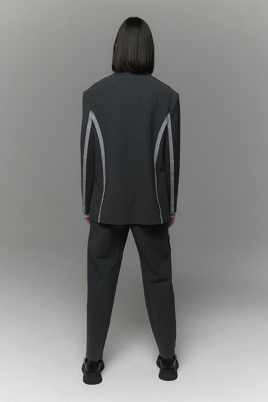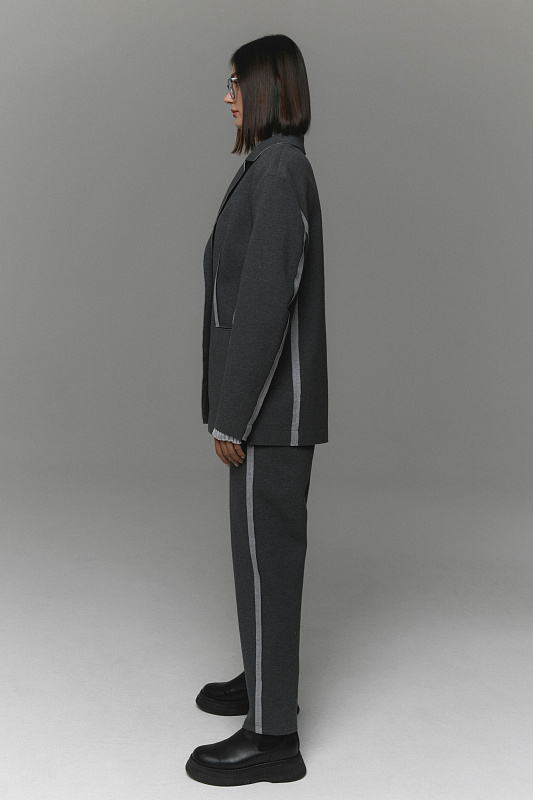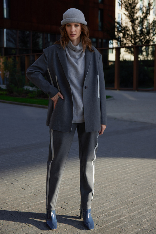 Высокая посадка и свободный крой этих зауженных книзу брюк из плотного джерси выгодно обыгрывают любой тип фигуры. Удобная резинка гарантирует отсутствие дискомфорта в области талии. В боковых швах предусмотрены вместительные карманы. Оригинальное дизайнерское решение – открытые боковые швы-лампасы, благодаря которым брюки приобретают эксклюзивный внешний вид. Можно сочетать с жакетом из той же капсулы.