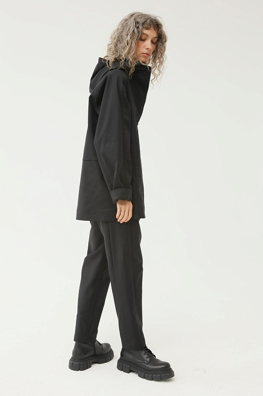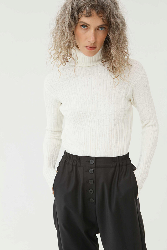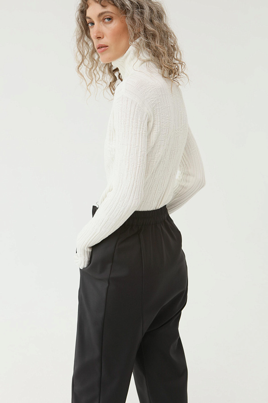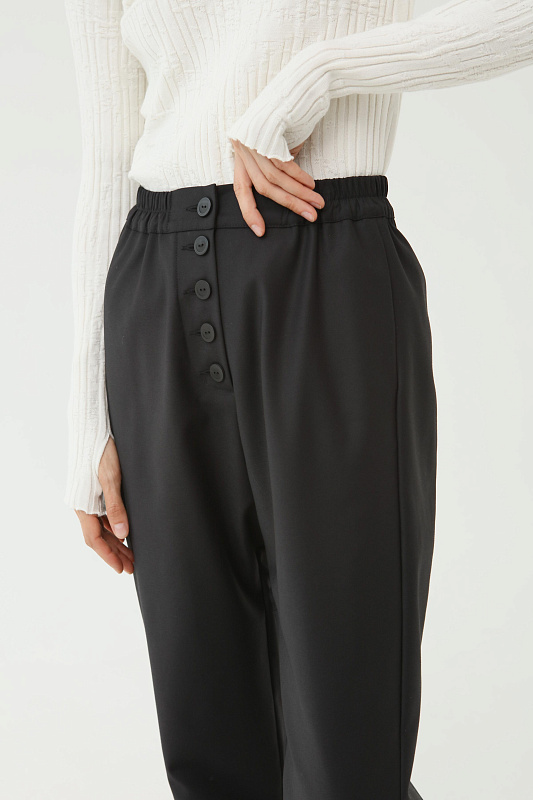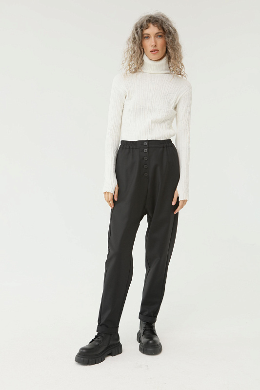 Брюки джоггеры зауженного книзу силуэта оригинальной дизайнерской конструкции. Карманы в швах, пояс брюк на резинке и пуговицах.