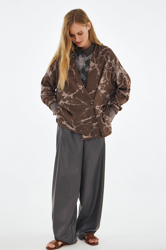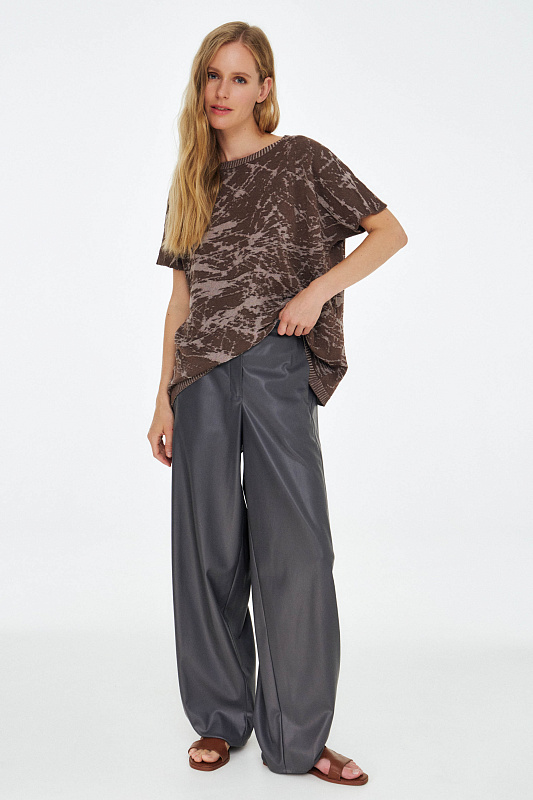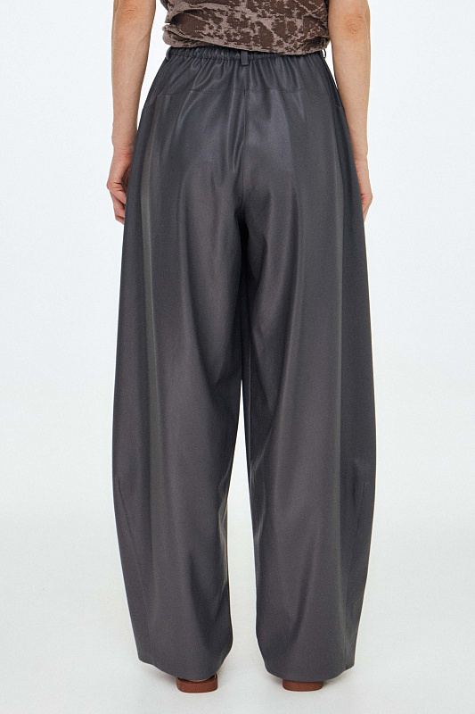Оригинальная модель из экокожи — это современная и стильная альтернатива традиционным кожаным брюкам. Свободные в бедрах и зауженные к низу дополнительной строчкой брюки бананы делают соблазнительным изгиб силуэта. Задняя кокетка - это деталь, которую дизайнеры добавили в крой. Именно она отвечает за посадку и от нее зависит то, насколько привлекательным будет ваш вид сзади. Классическая брючная застежка-молния и пуговица спереди, удобные карманы и пояс на резинке сзади добавляют комфорта. Модель выполнена из экокожи, особенностью которой является эластичность и простота ухода. Брюки из экокожи уже сами по себе являются акцентной частью вашего образа. Поэтому для создания стильного комплекта можно спокойно подбирать неброский верх, чтобы образ смотрелся гармонично. Брюки идеально подходят для различных сезонов.