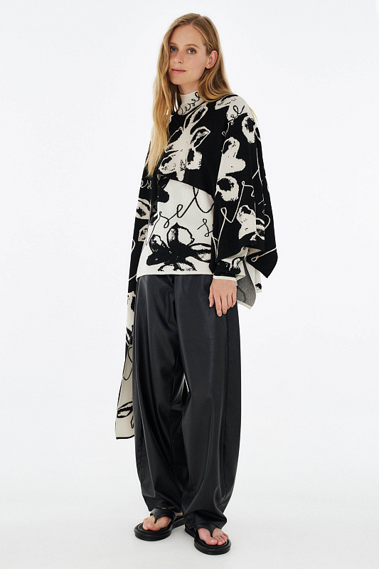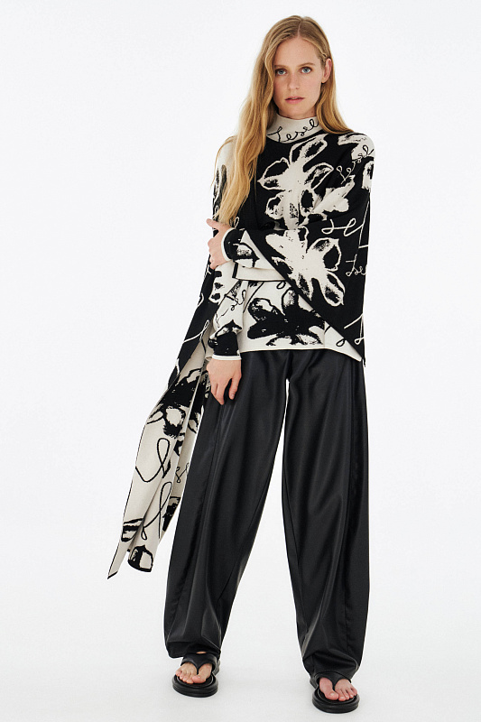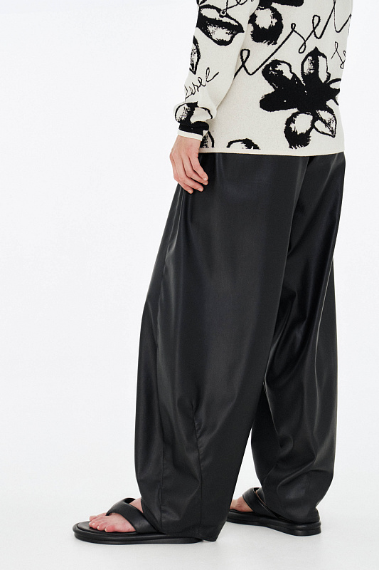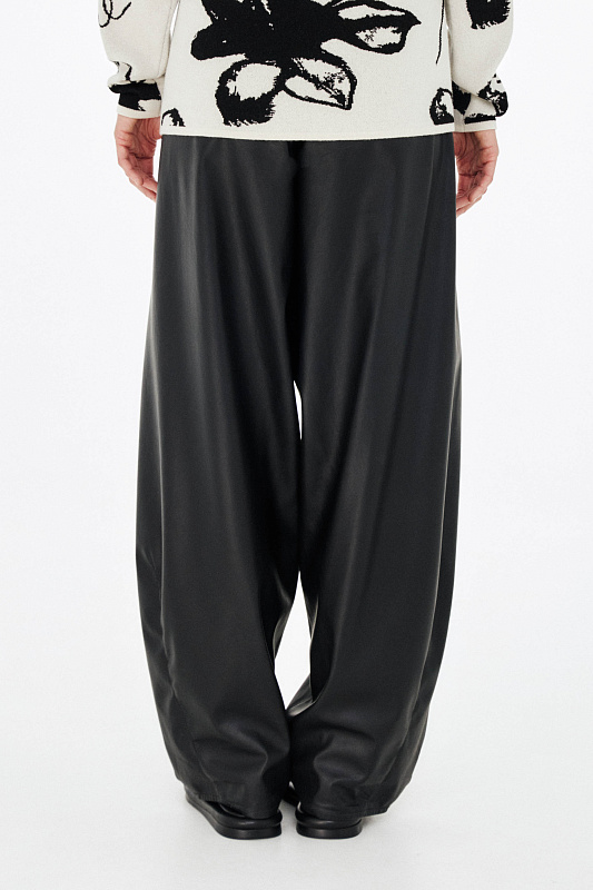Оригинальная модель из экокожи — это современная и стильная альтернатива традиционным кожаным брюкам. Свободные в бедрах и зауженные к низу дополнительной строчкой брюки бананы делают соблазнительным изгиб силуэта. Задняя кокетка - это деталь, которую дизайнеры добавили в крой. Именно она отвечает за посадку и от нее зависит то, насколько привлекательным будет ваш вид сзади. Классическая брючная застежка-молния и пуговица спереди, удобные карманы и пояс на резинке сзади добавляют комфорта. Модель выполнена из экокожи, особенностью которой является эластичность и простота ухода. Брюки из экокожи уже сами по себе являются акцентной частью вашего образа. Поэтому для создания стильного комплекта можно спокойно подбирать неброский верх, чтобы образ смотрелся гармонично. Брюки идеально подходят для различных сезонов.